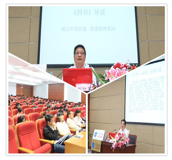 讲座初始,刘院长对我院主推的修身工程之一的读书活动进行了介绍。之后,刘院长从“我们的精神家园正在沦落”这一社会问题和近期上海市读书调查报告谈起,提出了精神家园重建的必要性!接着刘院长开始阐述何谓“经典”、经典读法,并就《四书》展开了导读:《大学》中的修身治国之道,《中庸》中的完美处世之道,《论语》中的“仁”和“孝”,《孟子》中的“民本”与“正气,刘院长的解读让大家从宏观上对四书有了进一步的理解和认识,也激发了大家对四书的阅读兴趣。
