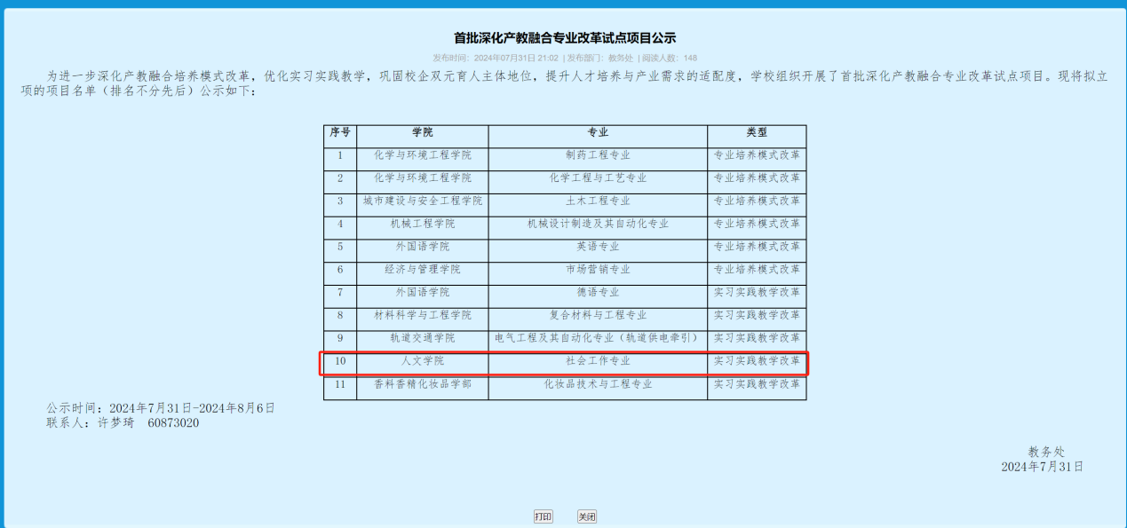 本次产教融合专业合作建设试点单位的评选,旨在推动人才培养紧密对接产业升级和技术变革趋势,深化产教融合、校企合作,切实加强社会工作专业教育的适应性。社会工作专业的成功申报,既是对过去一流专业建设成绩的肯定,也对今后专业建设提出了更高的要求。人文学院社会工作专业是学院倾力打造的培养新时代社会工作专业人才的特色专业。深化产教融合培养改革的重大开局,人文学院继续先行先试,社会工作专业在3+1探索基础上优化整合与深化融合,全面推进社工、社保和文产三个专业落实梯队化实践教学改革,探索各专业产教融合特色模式,完善与行业对接落地的实践教学体系改革,提升和保障人才培养质量,并期待共同协同推出人才培养与教学改革上的重大成果。