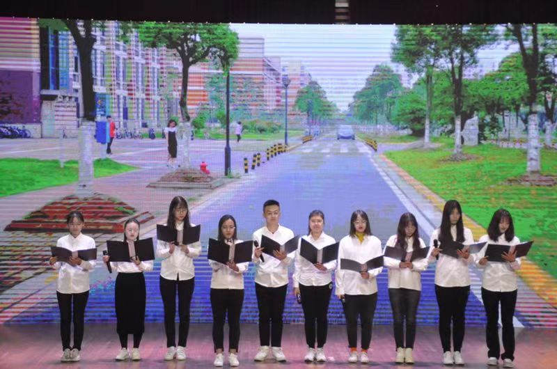 开幕仪式环节中,书法与新媒体技术实现了高度的创新融合。接下来进行的经典诗词朗诵会分为“彪炳千秋,荡气回肠”、“峥嵘岁月,砥砺今朝”、“凝心铸魂,诗颂中华”三个篇章。《满江红》将其对国家朝廷的赤胆忠诚表达得淋漓尽致;辛弃疾的《永遇乐 京口北固亭怀古》唱出的是满腔的爱国热情;《长征组诗》以舞台剧的表演形式带领我们一同回顾了那段艰苦奋斗的岁月;《祖国啊,我亲爱的祖国》、《可爱的中国》、《少年中国说》承载着祖国70年的深刻记忆,70年的砥砺前行,表达了同学们对祖国最真挚的爱。