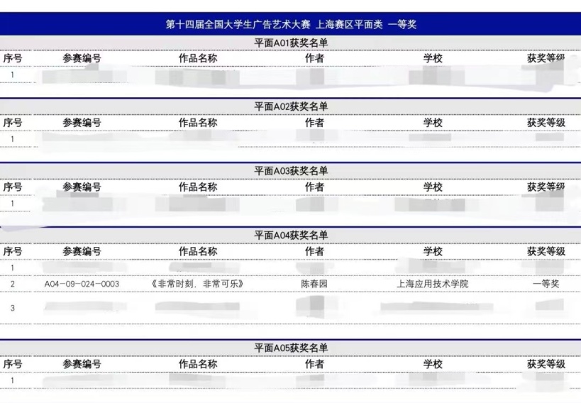 2022年6月底,上海应用技术大学人文学院文化产业管理专业陈春园同学参加第十四届全国大学生广告艺术大赛并获得上海赛区平面类一等奖。