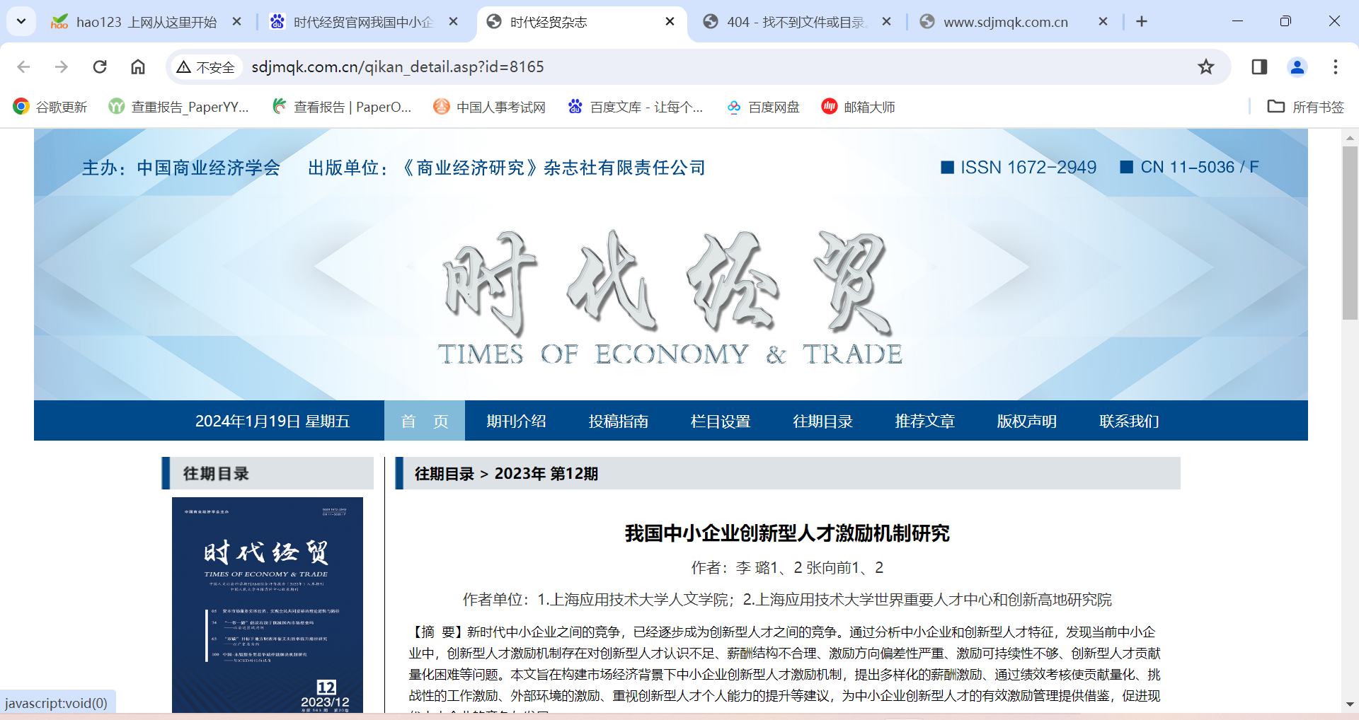 近日,上海应用技术大学人文学院2021级劳动与社会保障本科学生、世界重要人才中心和创新高地课题组李璐同学在中国商业经济学会主办《时代经贸2023年第12期发表《我国中小企业创新型人才激励机制研究》。