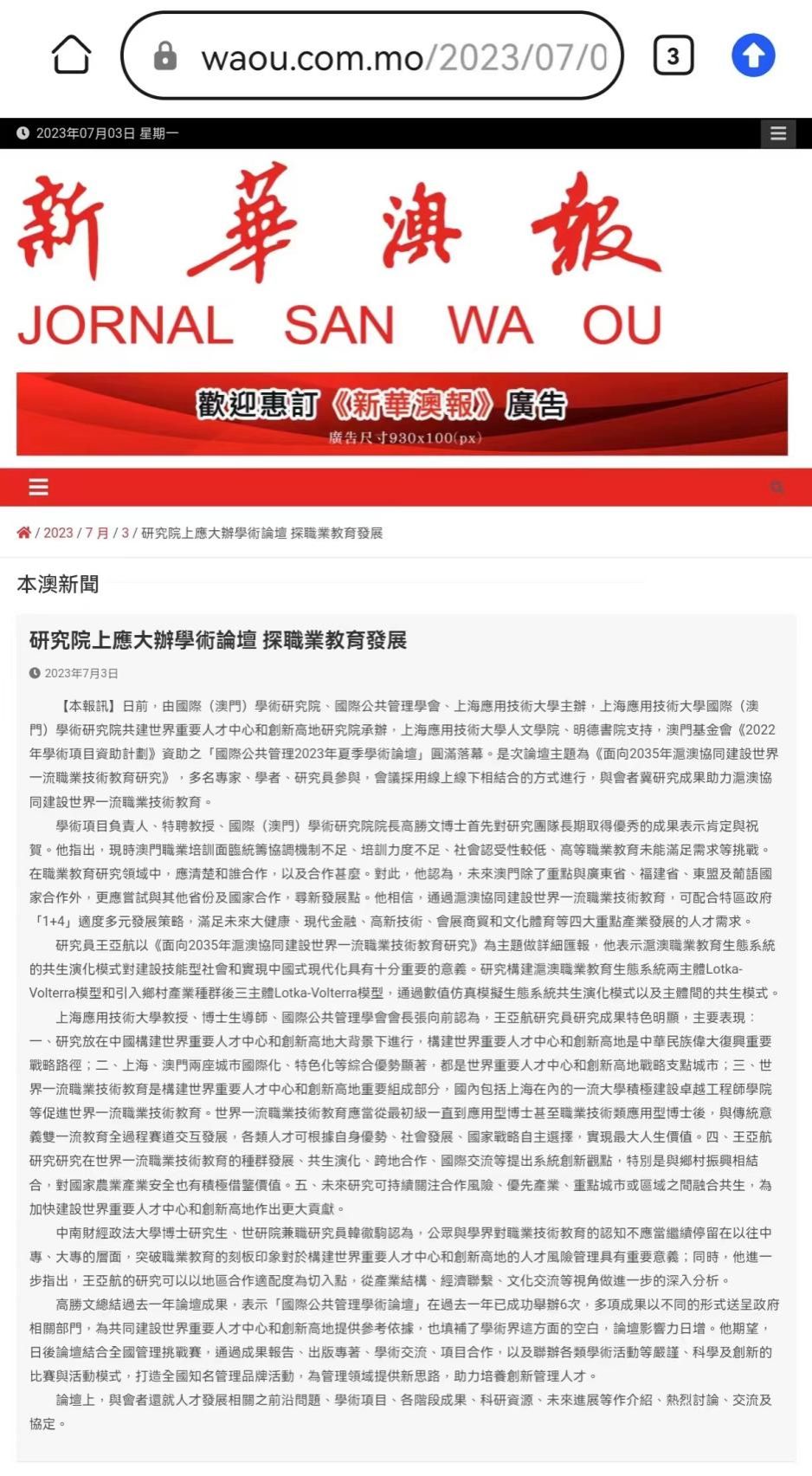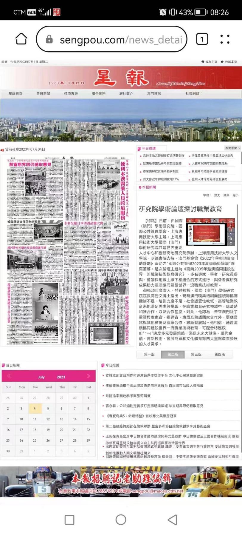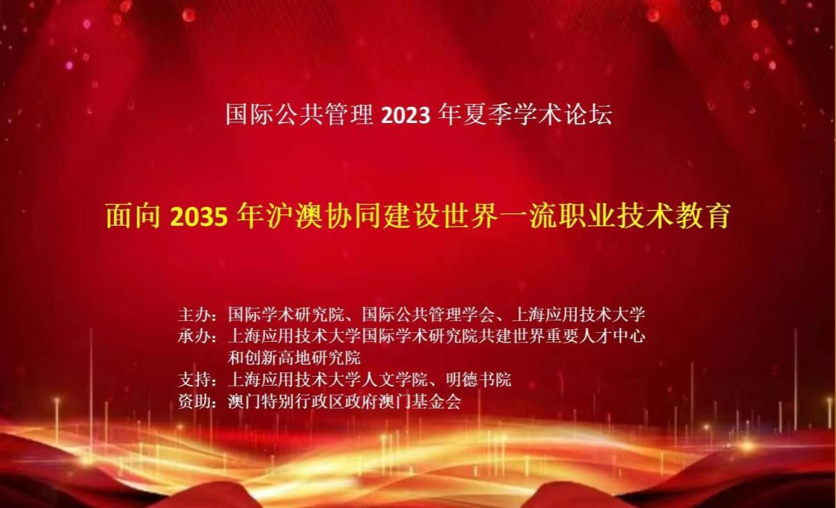 日前,由上海应用技术大学、国际(澳门)学术研究院、国际公共管理学会主办,上海应用技术大学国际(澳门)学术研究院共建世界重要人才中心和创新高地研究院承办,上海应用技术大学人文学院、明德书院支持,澳门基金会《2022年学术项目资助计划》资助之“国际公共管理2023年夏季学术论坛”圆满落幕。此次论坛主题为《面向2035年沪澳协同建设世界一流职业技术教育研究》,多名专家、学者、研究员参与,会议采用线上线下相结合的方式进行,与会者相信,研究成果可助力沪澳协同建设世界一流职业技术教育。