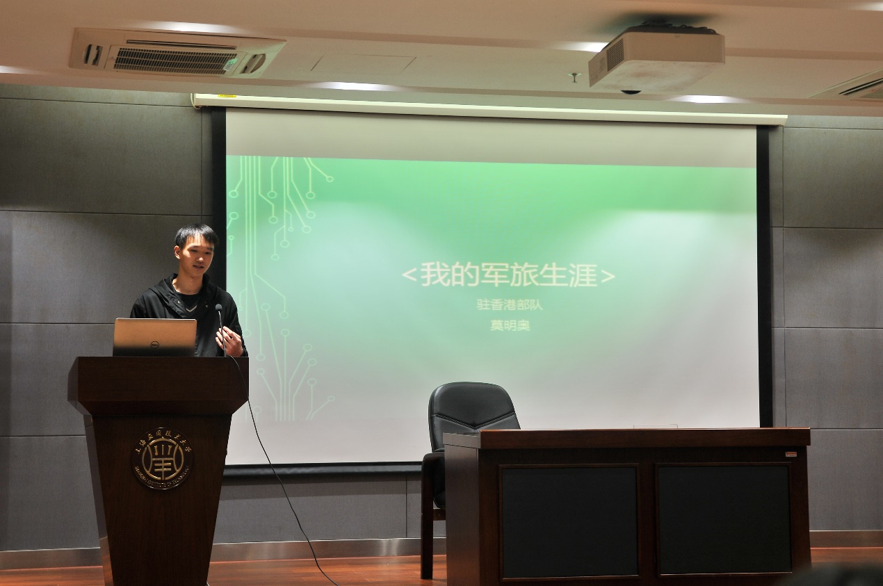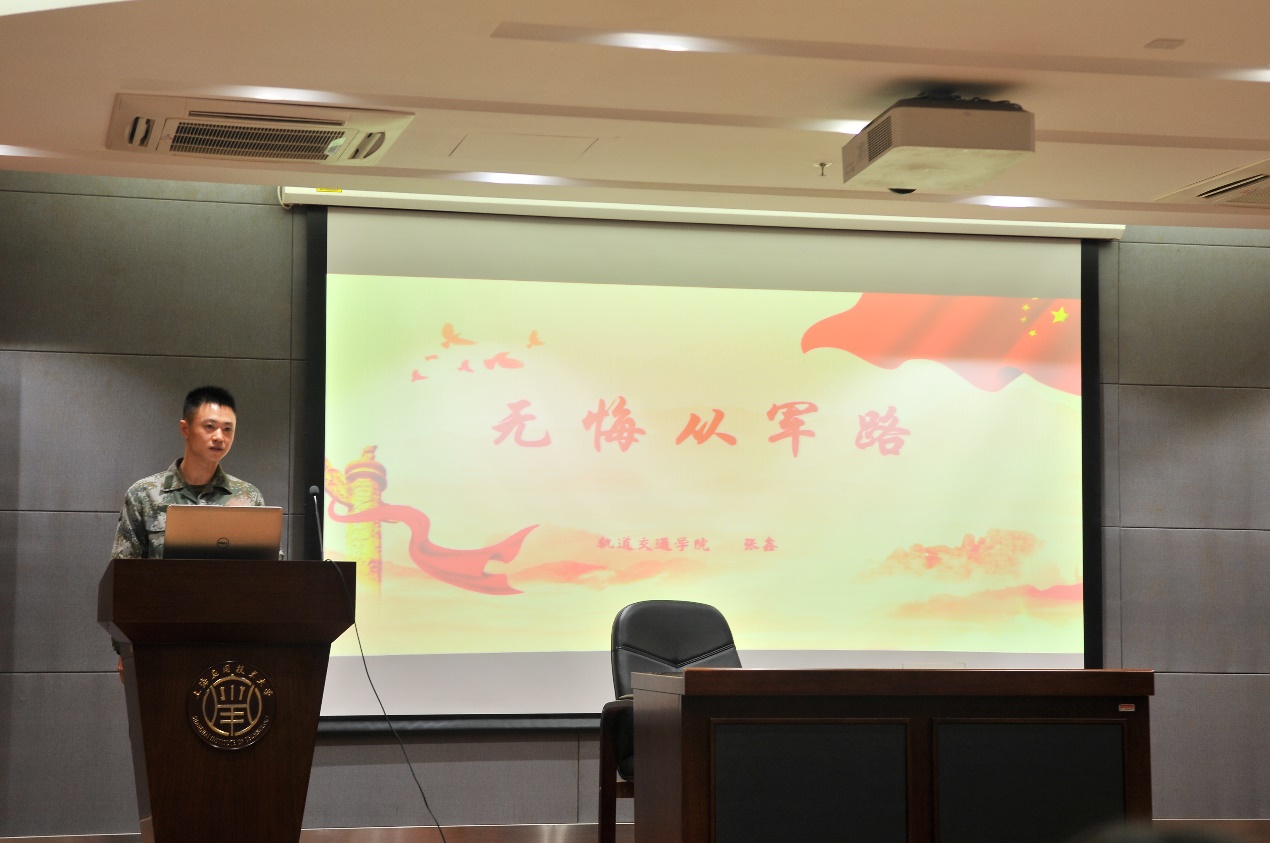 随后,退伍军人张士博以“一抹戎装绿,一生中国红”为主题,用轻松幽默的语言跟我们分享了他入伍前后的心路历程,他讲到:“每个人都喜欢舒适安逸的日子,但不吃苦就难以成才、成钢。”两年的军旅生活让他从一名无所事事的大学生成功蜕变为一名热血担当的军人。驻港部队退伍军人莫明奥用两个短片帮助同学们更加清楚的了解部队的生活。最后,轨交学院张鑫也分享了自己的入伍初衷和部队成长经历。