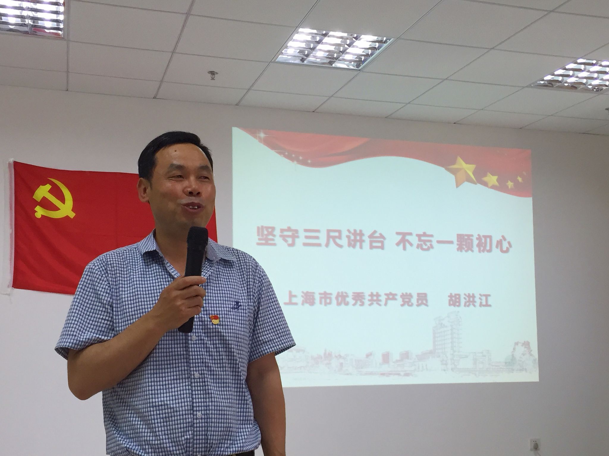 本次主题党日活动共分三个环节。第一部分为“学习新思想—师生同上一堂党课”。上海市优秀共产党员、理学院胡洪江老师为全体党员做了《坚守三尺讲台,不忘一颗初心》的报告,胡老师以风趣幽默的语言、谦和真诚的态度诠释了他在本职工作中对教师这颗初心的坚守,对党员这份使命和责任的担当