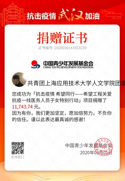 新年伊始,“新冠”来袭,不断蔓延的肺炎疫情时刻牵动着人心。在疫情防控的关键阶段,学院党总支和学院团委高度重视,迅速反应,积极行动,向每一位师生党员发出自愿捐款的倡议,弘扬“天下兴亡,匹夫有责”的担当精神,为疫情防控助力。人文学院团委积极响应学院党组织的号召,开展了关爱抗疫一线医务人员子女特别行动。募捐活动充分尊重组织成员个人意愿,秉持自愿原则,量力而行。人文学子在接到各班团支书的通知后,反响热烈,自愿通过支付宝、微信等形式踊跃捐款,支持疫情防控工作,为抗疫一线医务人员的子女们送去关心和爱心补助。最终,全院各个团支部自愿捐款总数达到11743.74元,以学院团委的名义统一捐款给了中国青少年发展基金会。