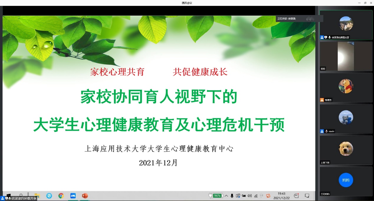 最后,于晓鹏为各位家长作了“家校协同育人视野下的大学生心理健康教育及心理危机干预讲座。他从当前大学生心理压力的众多表现为切入点,为家长介绍了如何进行心理危机的识别、如何应对心理危机等方面内容。希望家校协同,共同促进孩子的健康成长。