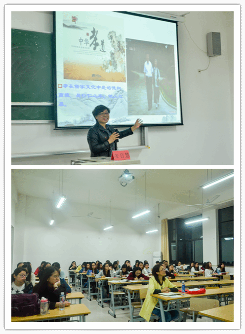 讲座伊始,张教授指出传统孝道面临严峻挑战,孝亲尊老意识淡漠,责任担当缺失。面对孝文化的发展现状,张教授特别强调“孝在儒家文化中是始德和首德,是行仁之本、做人之基。”接着,张教授简述传统孝道的内涵。她认为孝道体现在以下三大方面:一、孝顺、尊敬父母。立身立功,以显父母;对父母尽赡养义务,与父母交谈时注意分寸;对父母敬养,以和气、愉色、婉容之态与父母相处。二、尊重、关爱天下老人。以广阔之胸襟、深切之情怀把关爱向周围传递。三、忠君与报效国家。孝道不仅体现在尊老,更体现在爱国。随后,张教授阐释了孝道伦理的失范与成因。孝道伦理失范表现在代际回馈失衡;孝道失范的原因主要体现在孝道文化的断裂与孝道教育的欠缺,以及多元价值观的冲击、市场法则的影响。最后,张教授提出“今天我们如何行孝”这一深刻问题。张教授认为,在日常生活中,我们应当感恩父母、孝敬父母,以自身的成人与成才来报答父母。从身边小事做起,多一句关心,少一分烦躁,心怀恩情,平和相处。