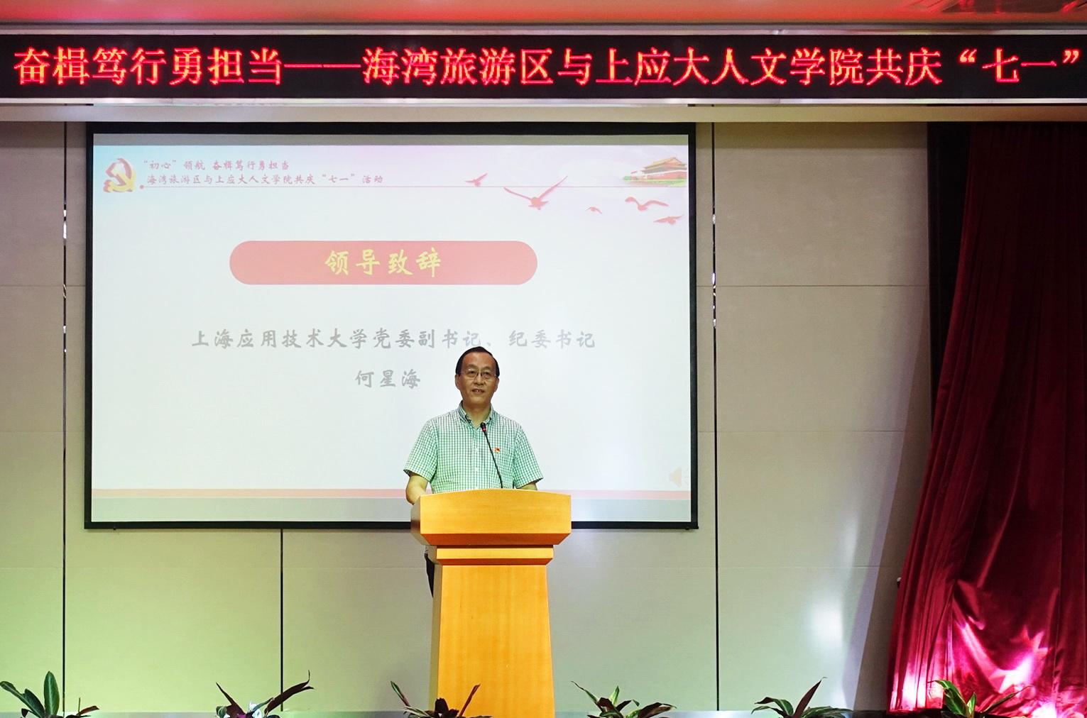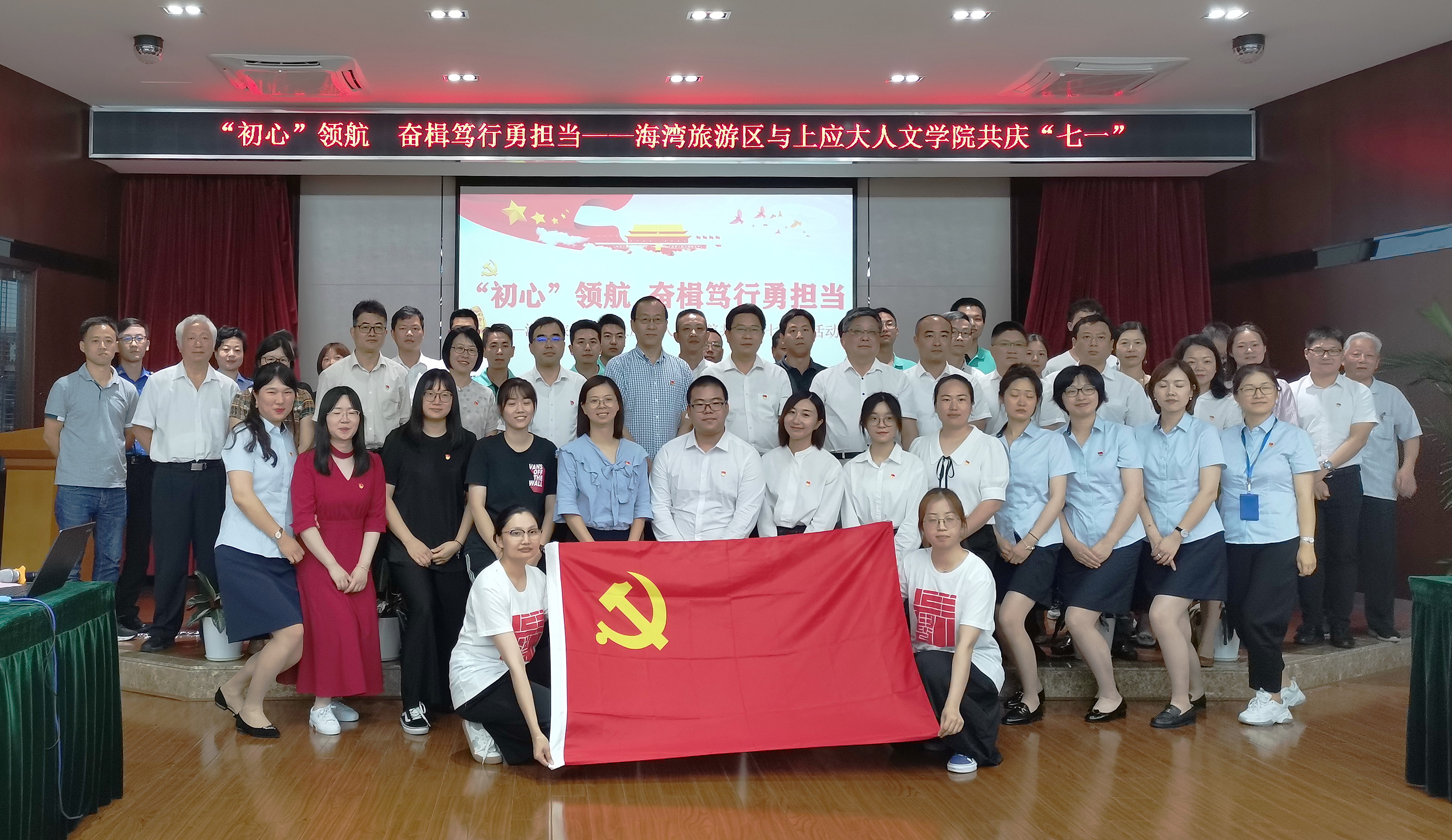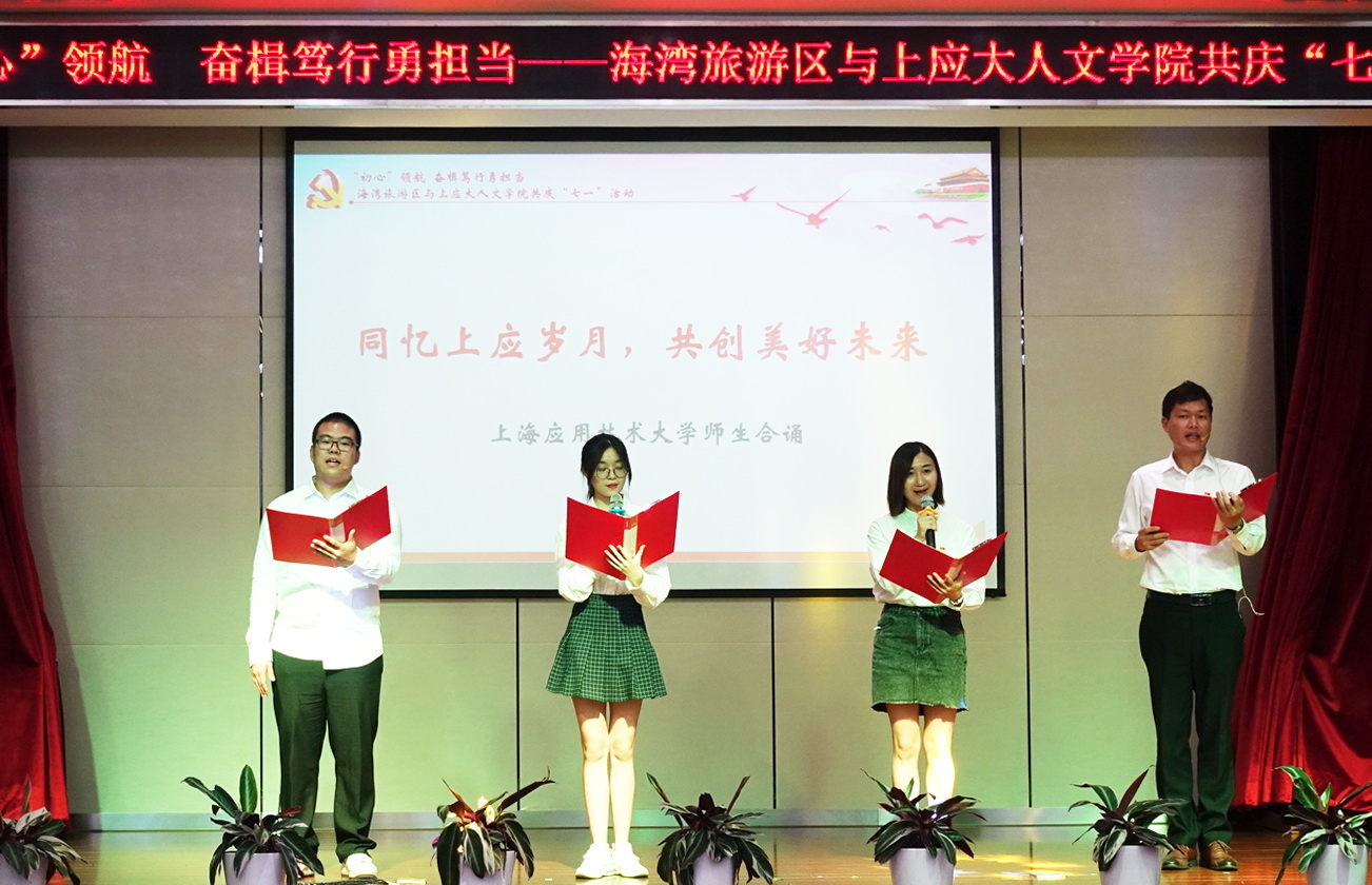 6月29日,“初心领航 奋楫笃行勇担当”--人文学院与海湾旅游区共庆“七一”活动在海湾行政中心顺利举办。上海应用技术大学党委副书记、纪委书记何星海,奉贤区区委组织部副部长、区社会工作党委书记黄军华,学院党总支书记周文,院长刘红军,海湾旅游区党政领导,校党委组织员陈方敏,师生代表及海湾旅游区基层党组织代表参加。