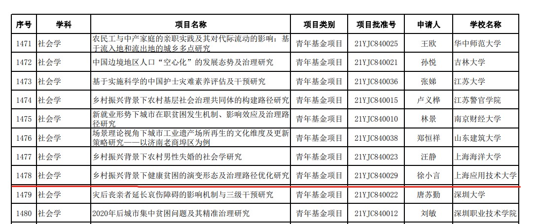 凝心聚力谋发展,“青椒”科研结硕果。8月19日,教育部2021年度人文社会科学研究一般项目立项结果公示,人文学院徐小言老师申报的青年基金项目《乡村振兴背景下健康贫困的演变形态及治理路径优化研究》(项目批准号:21YJC840029)获准立项,是人文学院又一个教育部人文社科青年基金项目。
