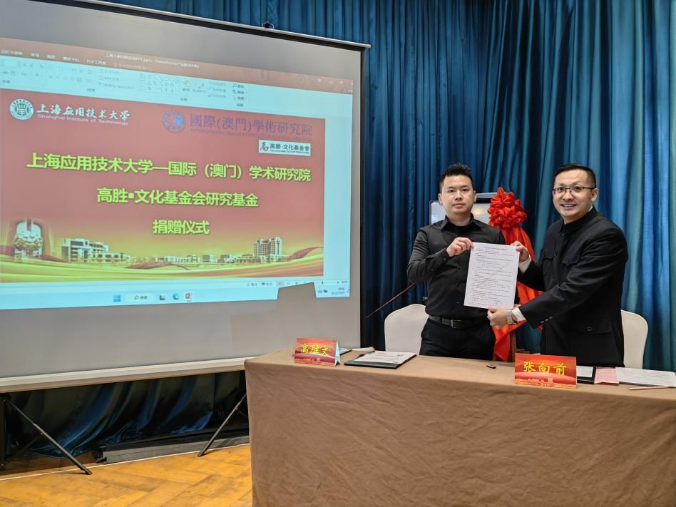 为庆祝上海应用技术大学70周年校庆,国际学术研究院高胜.文化基金会宣佈,向上海应用技术大学捐赠10万澳门元款项,用作支持师生科研、少数民族、贫困生及境外生奖助学金等,以助力国家教育事业发展,以实际行动践行爱国爱澳。