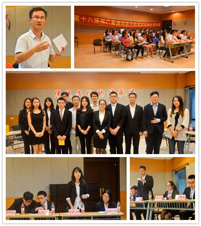 9月16日晚18:00,由教务处、团委主办,人文学院承办的第十八届推广普通话宣传周系列活动之辩论赛在大学生活动中心103室举行,本次辩论赛以“传统文化的传承应融入流行还是原汁原味”为辩题,来自校团委的陈贝妮、城建学院的王云杰、人文学院的周雄才三位老师担任比赛评委,全场近50名学生观摩了比赛。