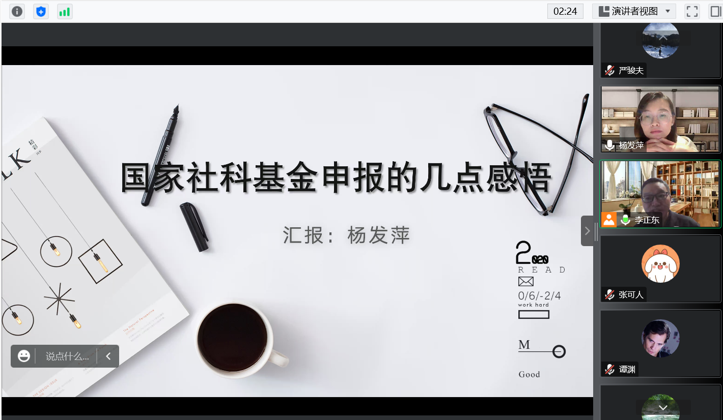 在三位课题申报经验分享者汇报之后,社会工作系的严骏夫博士分享了他的参会心得体会,他指出三位分享者成功的共通之处在于都切实做好了“两大关、一环节”,即攻克选题关、做好撰写关、牢记复盘环节,三位分享人身上都具备着细心、专注、能钻研、善总结等品质和素养,值得青年教师们学习。