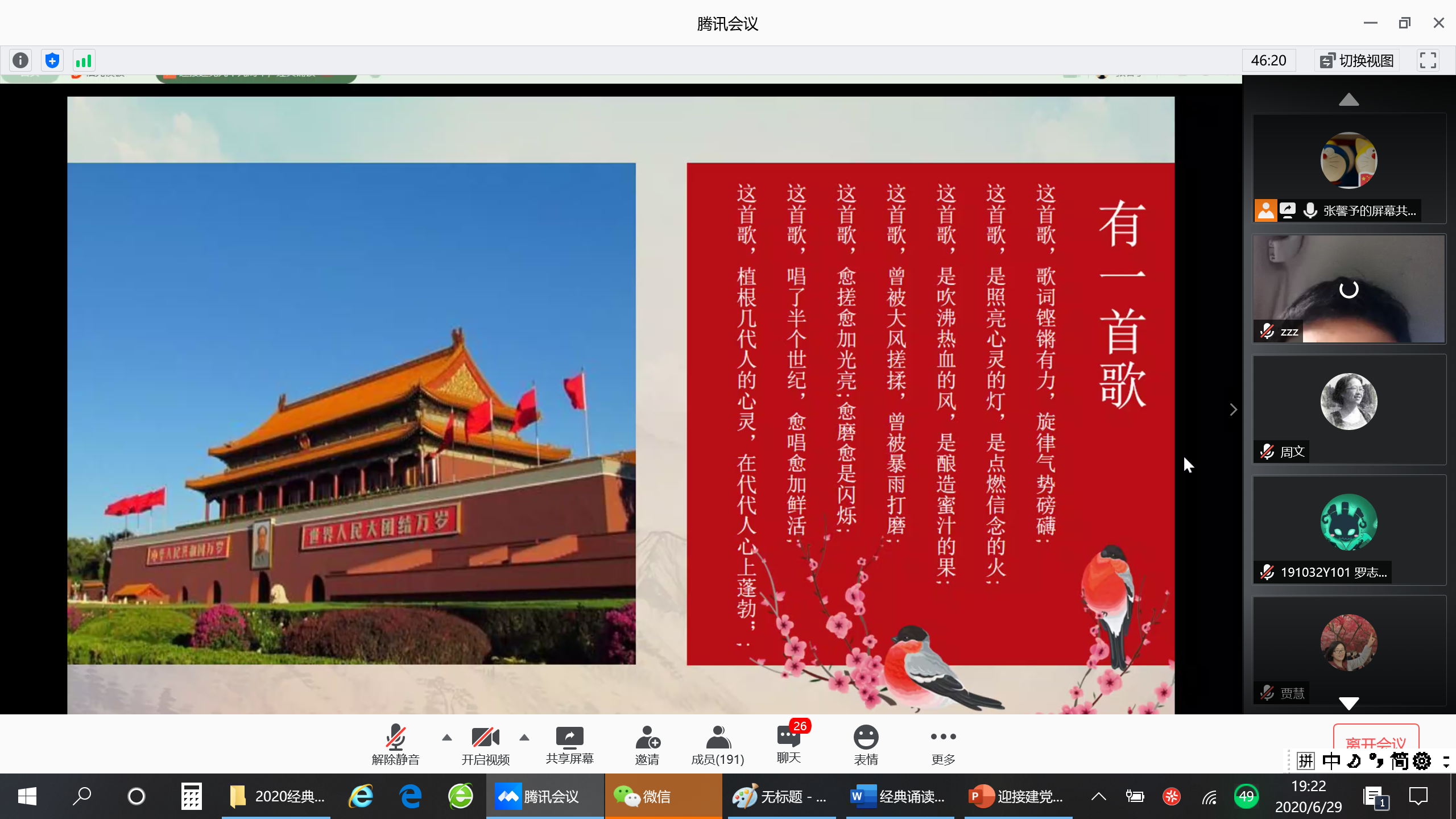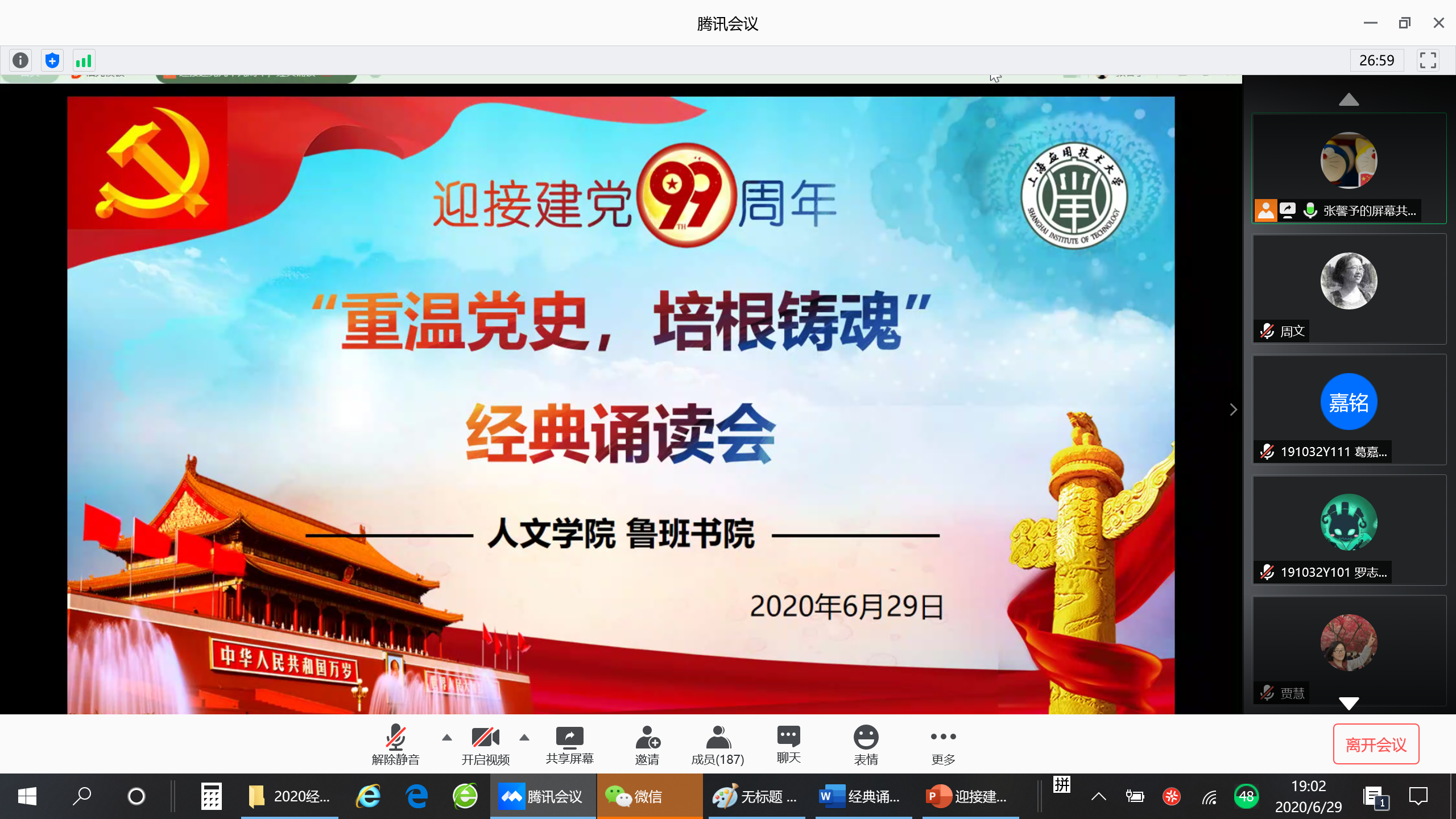 6月29日,人文学院、鲁班书院联合举办了庆祝建党九十九周年“重温党史 培根铸魂”经典诵读会。诵读会以云端方式进行,两个学院共200余位师生参加了此次活动。