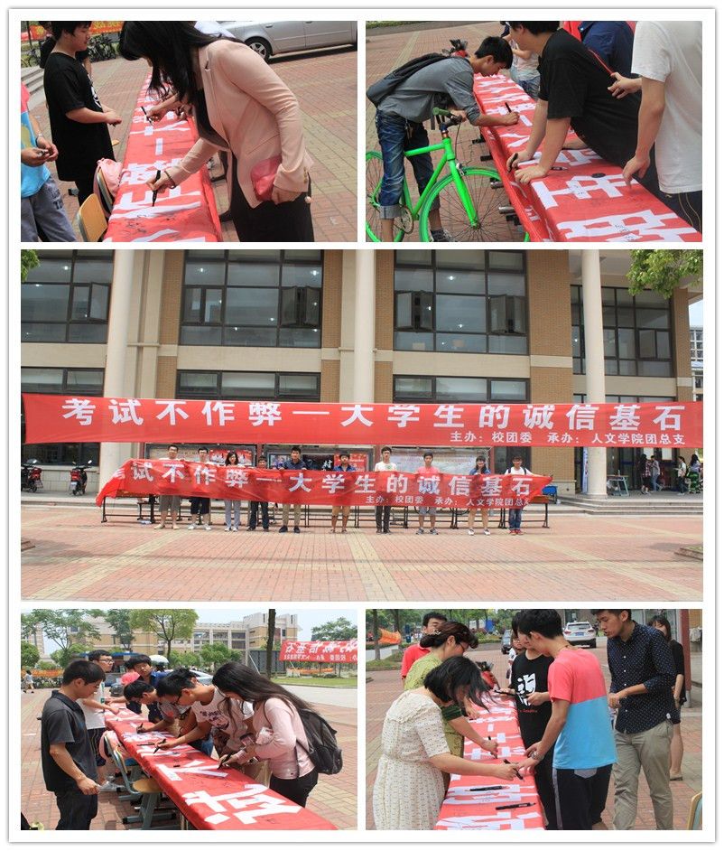 为树立诚信考风,建设优良学风,营造文明校风,提高我校学生诚信考试的意识,自觉抵制考试作弊行为,人文学院于6月5日在二食堂门口举 “诚信校园行”大型签名活动。活动由校团委主办,人文学院承办。