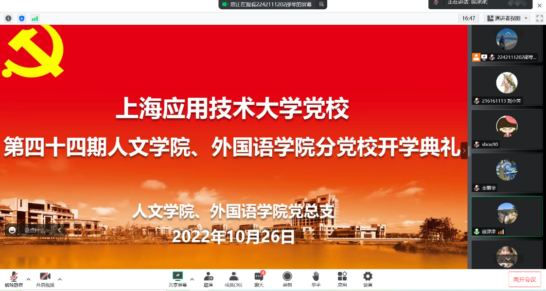 2022年10月26日,上海应用技术大学党校人文、外国语学院第44期分党校开学典礼在线上腾讯会议举行。人文学院党总支书记、分党校校长周文、副书记徐津津,外国语学院党总支书记、分党校校长李晓晶、副书记金丽华参加此次开班典礼。会议由党总支副书徐津津主持,来自人文学院和外国语学院的近40名学员参加了本次开学典礼。