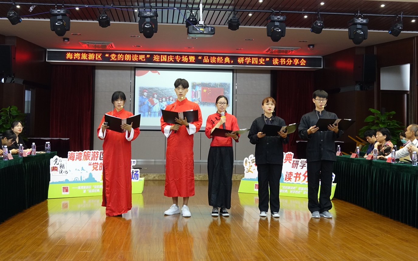 2020年9月15日下午,“党的朗读吧”暨“品读经典,研学四史”读书分享会活动在海湾行政中心举办。海湾旅游区党工委副书记、管委会主任姚红,党工委副书记周金华、人文学院党总支书记周文,副书记、副院长徐津津,师生代表及海湾旅游区基层党组织代表参加,用声音缅怀历史,用声音传递力量。