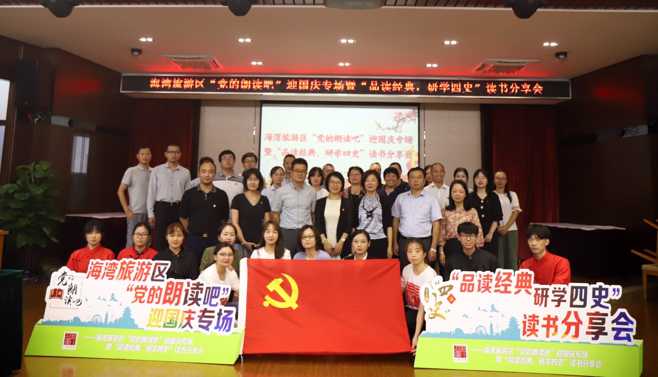 “党的朗读吧”是人文学院与海湾旅游区党工委的党建联建品牌项目,传承红色文化,弘扬红色精神,至今已举办了三年。本次系列活动在前期各单位选送节目的基础上,选出7个优秀作品集中展示。代表们分享了《光荣老太吴慧珍的故事》、《细节的力量---新中国的伟大实践》、《伟大的开端》、《苦难辉煌》等篇章的读书体会,人文学院的学生也展示了经典作品《可爱的中国》,将朗诵与感悟、交流融合贯通,70年的建国成就足以告慰先烈,也借此向伟大的中国共产党献上祝福。
