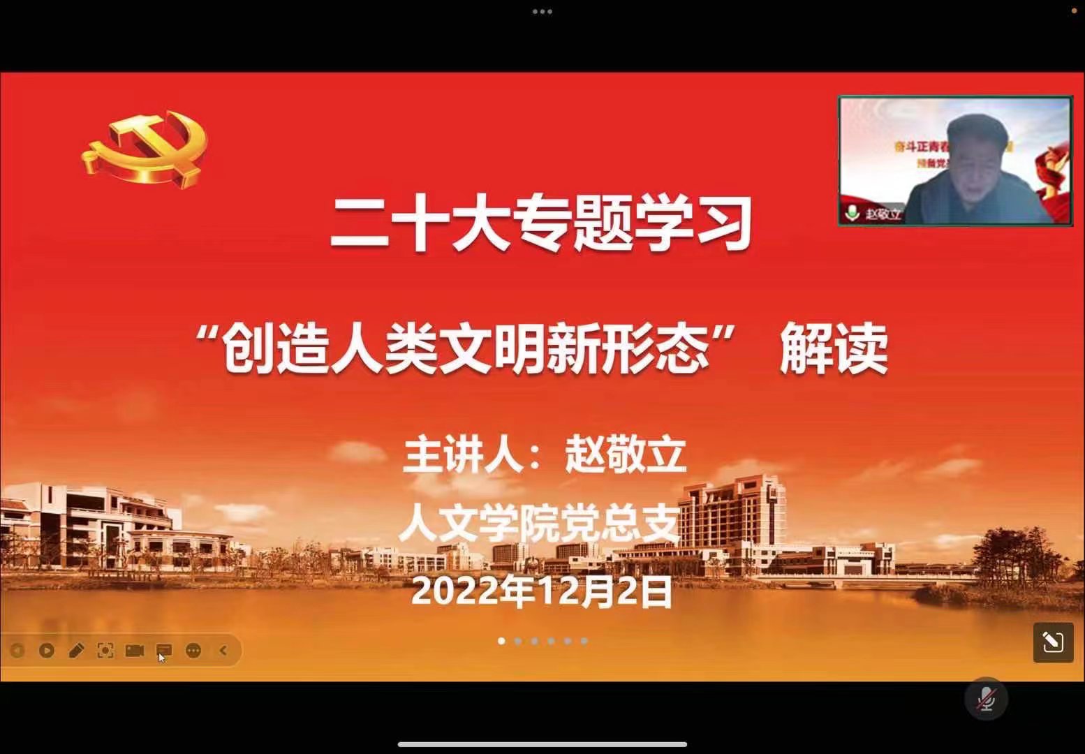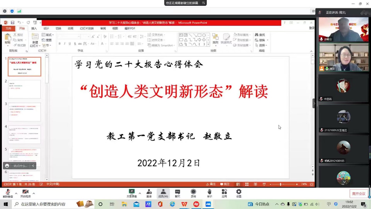 为深入学习好、宣传好、贯彻好党的二十大报告精神,12月2日晚,人文学院党总支委员赵敬立老师为学院全体师生党员、发展对象和入党积极分子共一百余人,开展了解读“创造人类文明新形态”的线上讲座,人文学院党总支书记周文老师主持了本次讲座,掀起了学院学习贯彻党的二十大精神的热潮。