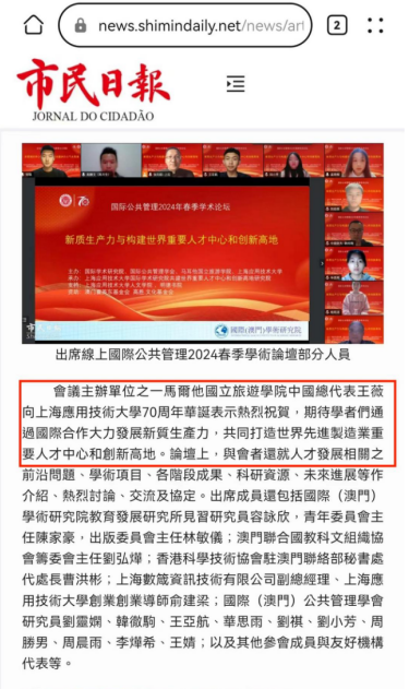 会议主办单位之一马尔他国立旅游学院中国总代表王薇向上海应用技术大学70周年华诞表示热烈祝贺,期待学者们通过国际合作大力发展新质生產力,共同打造世界先进製造业重要人才中心和创新高地。论坛上,与会者还就人才发展相关之前沿问题、学术项目、各阶段成果、科研资源、未来进展等作介绍、热烈讨论、交流及协定。出席成员还包括国际学术研究院教育发展研究所见习研究员容咏欣,青年委员会主任陈家豪,出版委员会主任林敏仪;澳门联合国教科文组织协会筹委会主任刘弘燁;香港科学技术协会驻澳门联络部秘书处代处长曹洪彬;上海数箴资讯技术有限公司副总经理、上海应用技术大学创业创业导师俞建梁;国际公共管理学会研究员刘灵嫻、韩彻驹、王亚航、华思雨、刘祺、刘小芳、周胜男、周晨雨、李燁希、王婧;以及其他参会成员与友好机构代表等。