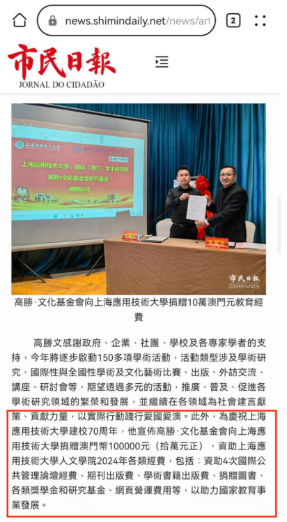 高胜‧文化基金会向上海应用技术大学捐赠10万澳门元教育经费