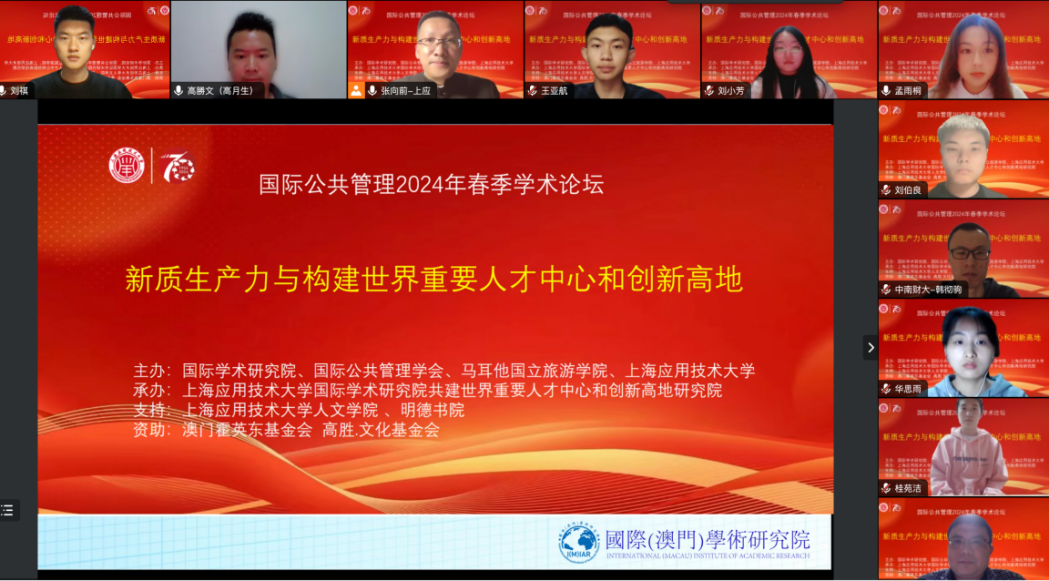 日前,由国际学术研究院、国际公共管理学会、马耳他国立旅游学院、上海应用技术大学主办,上海应用技术大学国际学术研究院共建世界重要人才中心和创新高地研究院承办,上海应用技术大学人文学院、明德书院支持,澳门霍英东基金会、高胜•文化基金会资助之国际公共管理2024春季学术论坛圆满落幕。是次论坛主题为新质生产力与构建世界重要人才中心和创新高地,多名专家、学者、研究员参与,会议连续两天採用线上线下相结合方式进行,研究成果将助力新质生产力发展与我国构建世界重要人才中心和创新高地。