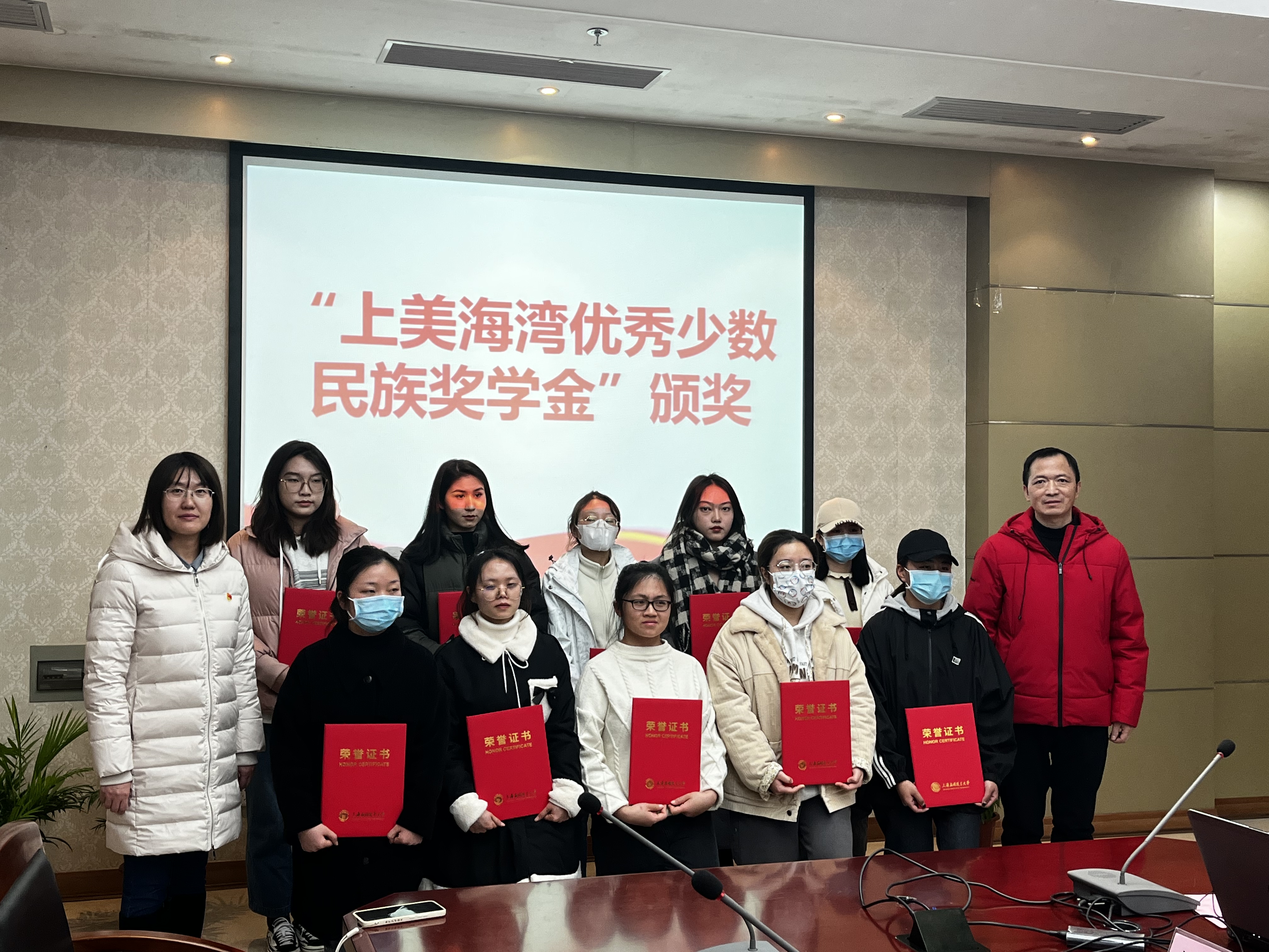 随后由副书记徐津津和统战部副部长于有进为15名获得“上美海湾优秀少数民族学生奖学金”颁奖,少数民族获奖学生代表麦迪娜•阿扎提发表获奖感言,该生表在今后的学习中,定当自立自强,发奋学习,刻苦钻研,用知识武装自己,用实践回馈学校,用真情回报社会,用行动报效祖国!