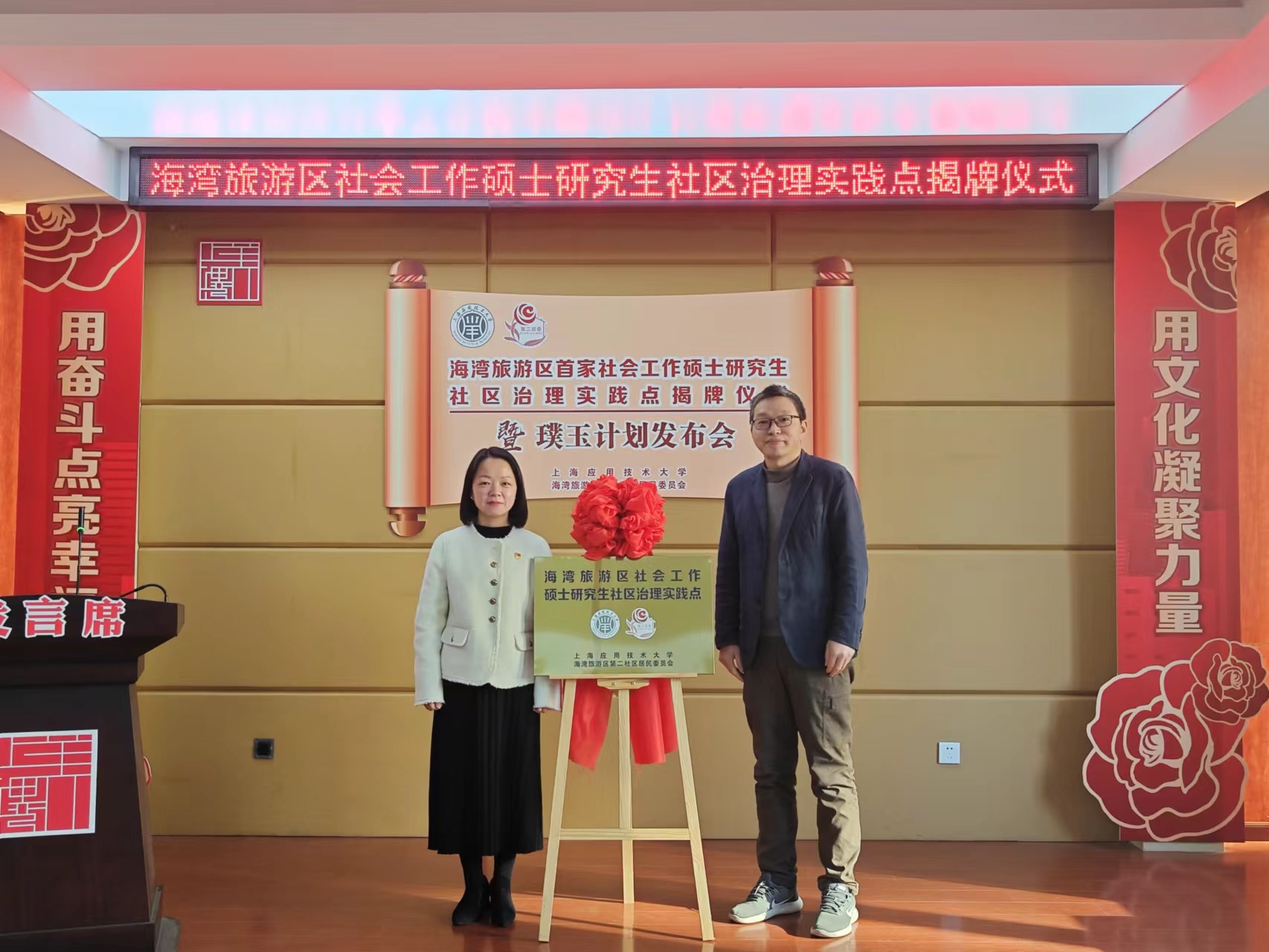 近日,为进一步强化区校联动,人文学院积极对接海湾旅游区第二社区居民委员会,基于高校新文科建设契机和城市社区治理共同体建设理念,以党建共建为抓手开创海湾旅游区“首个社会工作硕士研究生社区治理实践点”,启动以打造社会工作专业深度嵌入邻里场景的产教融合平台为目标的“璞玉计划”。海湾旅游区党工委副书记张平、海湾旅游区管委会副主任肖云、人文学院党总支书记周文、副院长李正东出席社区治理实践点揭牌仪式暨“璞玉计划”发布会。人文学院社会工作系部分专任教师、研究生导师、首届社会工作专业硕士研究生参加本次活动。