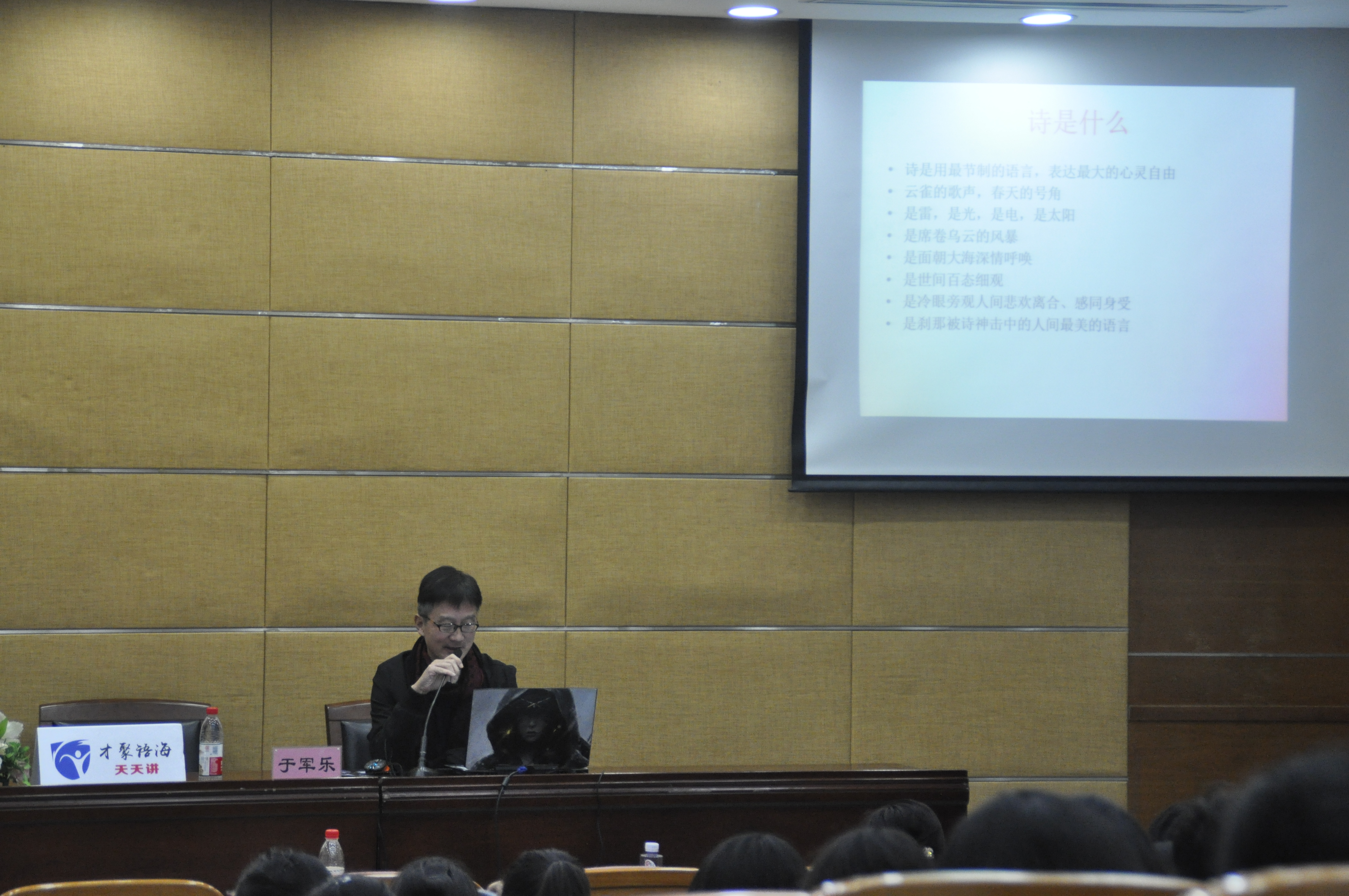 11月17日,由学工部(处)主办、人文学院承办的第二届诗词文化节系列活动之关于写诗那点事——对诗歌的认识与上海滩诗会的诗歌文化讲座在图书馆B102举行。本次讲座由上海滩诗会创始人、著名诗人于军乐先生主讲。各学院师生共计200余人参与。