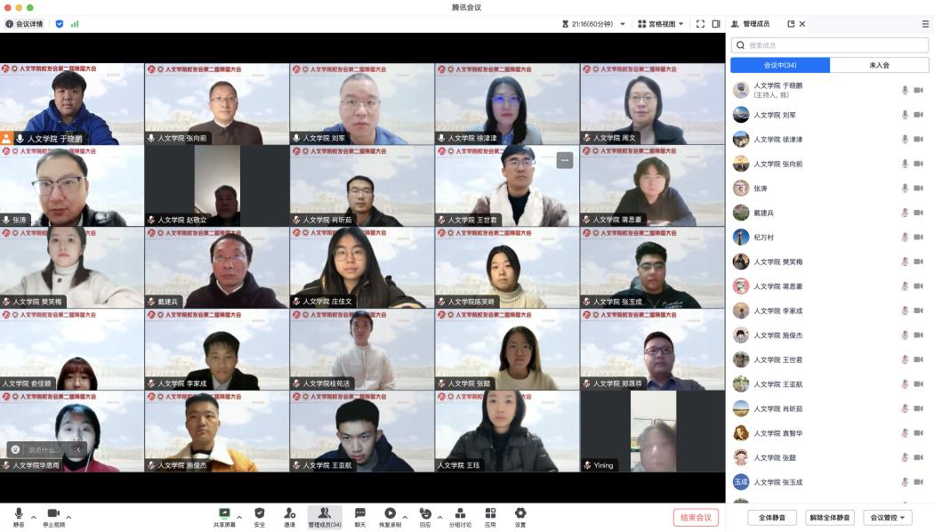 笃信前行,思源致远。2023125日,人文学院校友会举行换届大会暨第二届理事会第一次会议。人文学院党总支书记周文,人文学院院长张向前,人文学院校友会换届筹备工作领导小组成员、学院纪委委员、第一届理事会成员、校友代表、教师代表、学生代表共计36人出席会议。会议由人文学院党总支副书记、副院长徐津津主持。