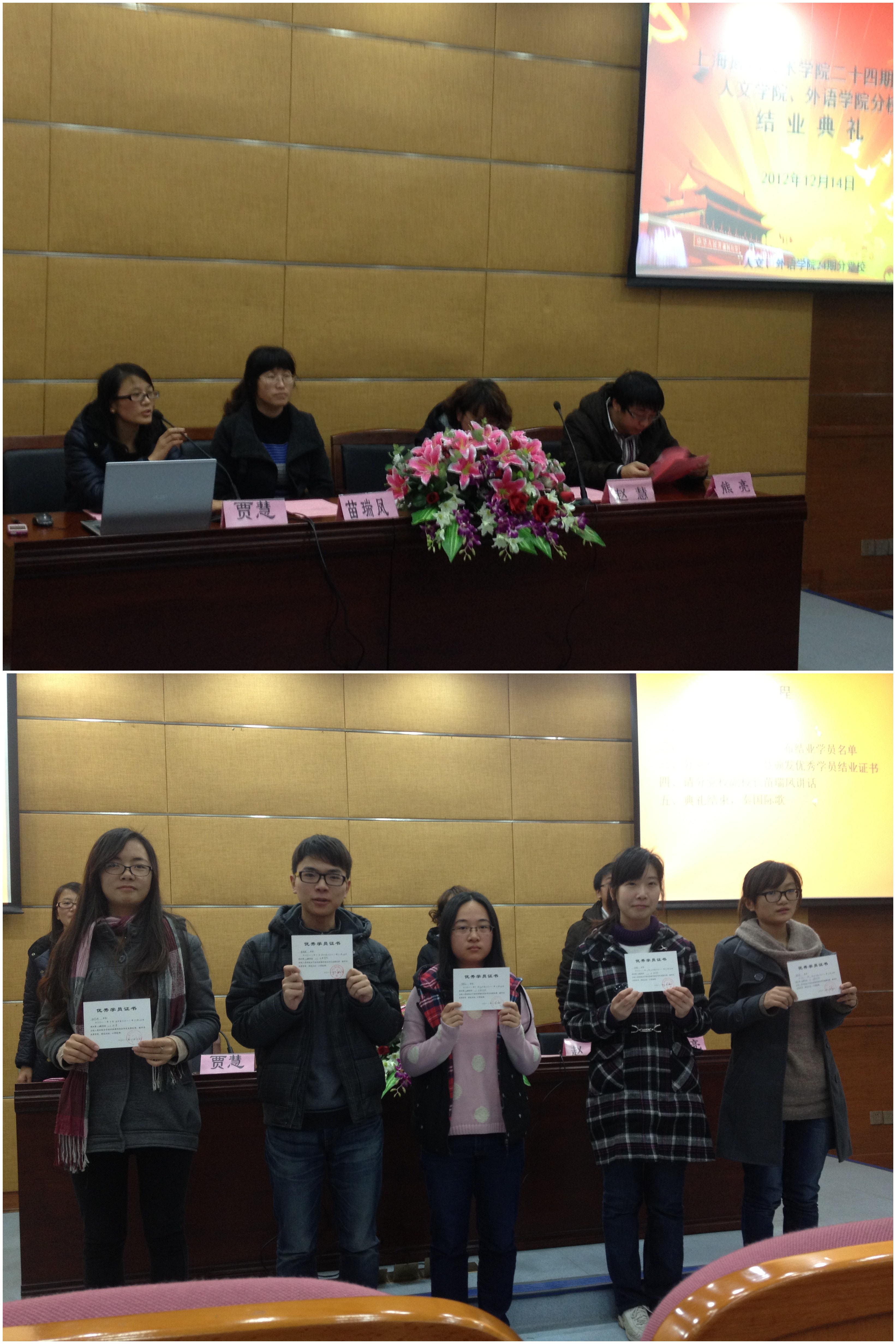 本次典礼共有5名优秀学员,外语学院党总支副书记赵慧给他们颁发了优秀学员证书,并表示热烈祝贺。最后,伴随着国际歌的奏响,典礼圆满结束。