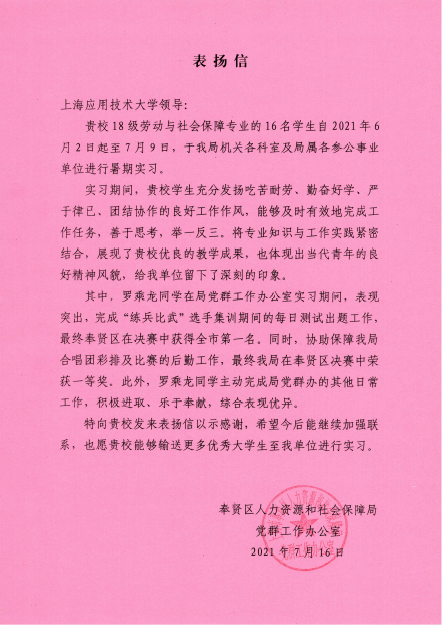 六周的实习得到了奉贤人保局相关实习岗位科室的高度认可,实习结束之际,他们特地寄来了表扬信,感谢同学们对人社局工作的支持,也期待未来有更多的合作。