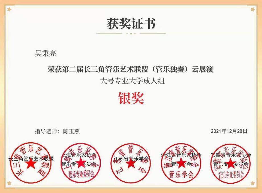 近日,我校人文学院陈玉燕老师指导的管乐团成员吴秉亮、霍思齐代表学校参加第二届长三角管乐艺术联盟云展演并获得银奖。