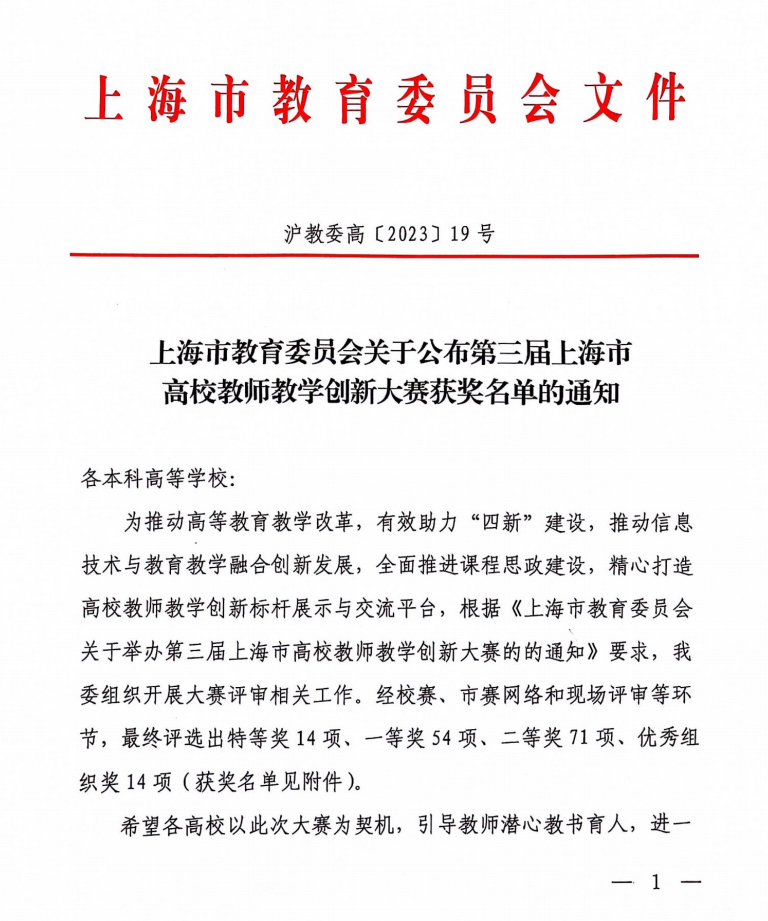 近日,上海市教育委员会公布了第三届上海市高校教师教学创新大赛获奖名单。上海应用技术大学荣获一等奖2项、二等奖3项,获奖总数创历史新高。人文学院徐小言老师荣获第三届上海市高校教师教学创新大赛新文科组一等奖。