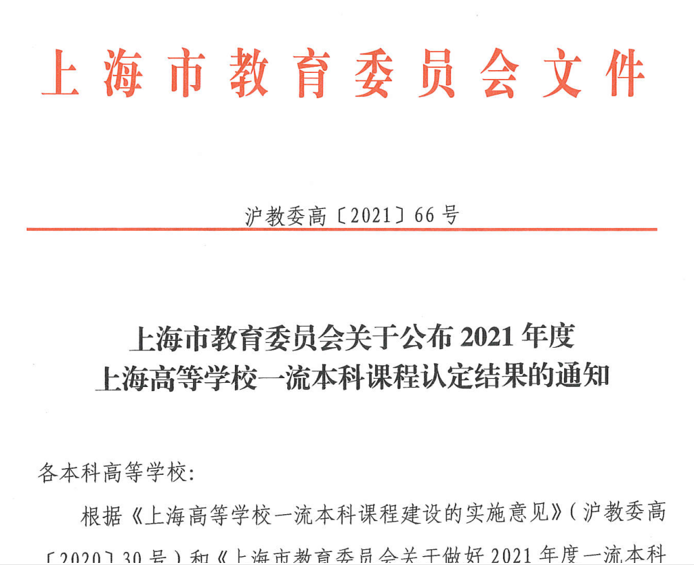 上海高等学校一流本科课程是上海市教委为全面推进上海高校课程体系建设而设立的重要项目,是上海高等学校课程建设领域级别最高、权威性最强、影响力最大、关注度最高的科研项目,其覆盖面广、影响大,具有重要的示范和引导作用,历来是各高校竞争和关注的焦点之一,是衡量高校课程质量和体系建设水平的重要标志,备受瞩目。在上海高等学校一流本科课程项目竞争日益广泛化和激烈化的情况下,此次我院教师获得一流本科课程认定,体现出了我院教学课程质量和体系建设的良好势头。