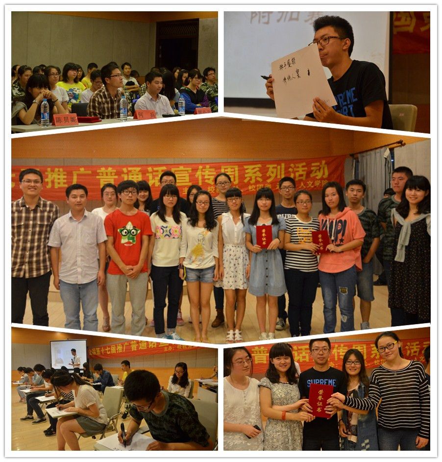 为了进一步丰富校园文化,弘扬中华优秀传统文化,促进规范用字,规范书写,培养同学们的听读能力,9月25日晚六点,第17届推普周系列活动之汉字听写大赛在大学生活动中心103室举行。此次活动由教务处、团委主办,人文学院承办。活动吸引了来自12个学院的代表队,校团委何兵,人文学院郭小兵、陈贝妮三位老师担任了本次比赛的评委。