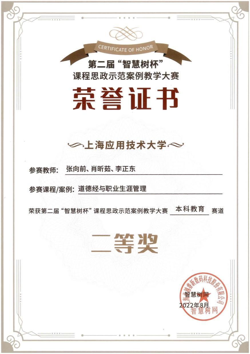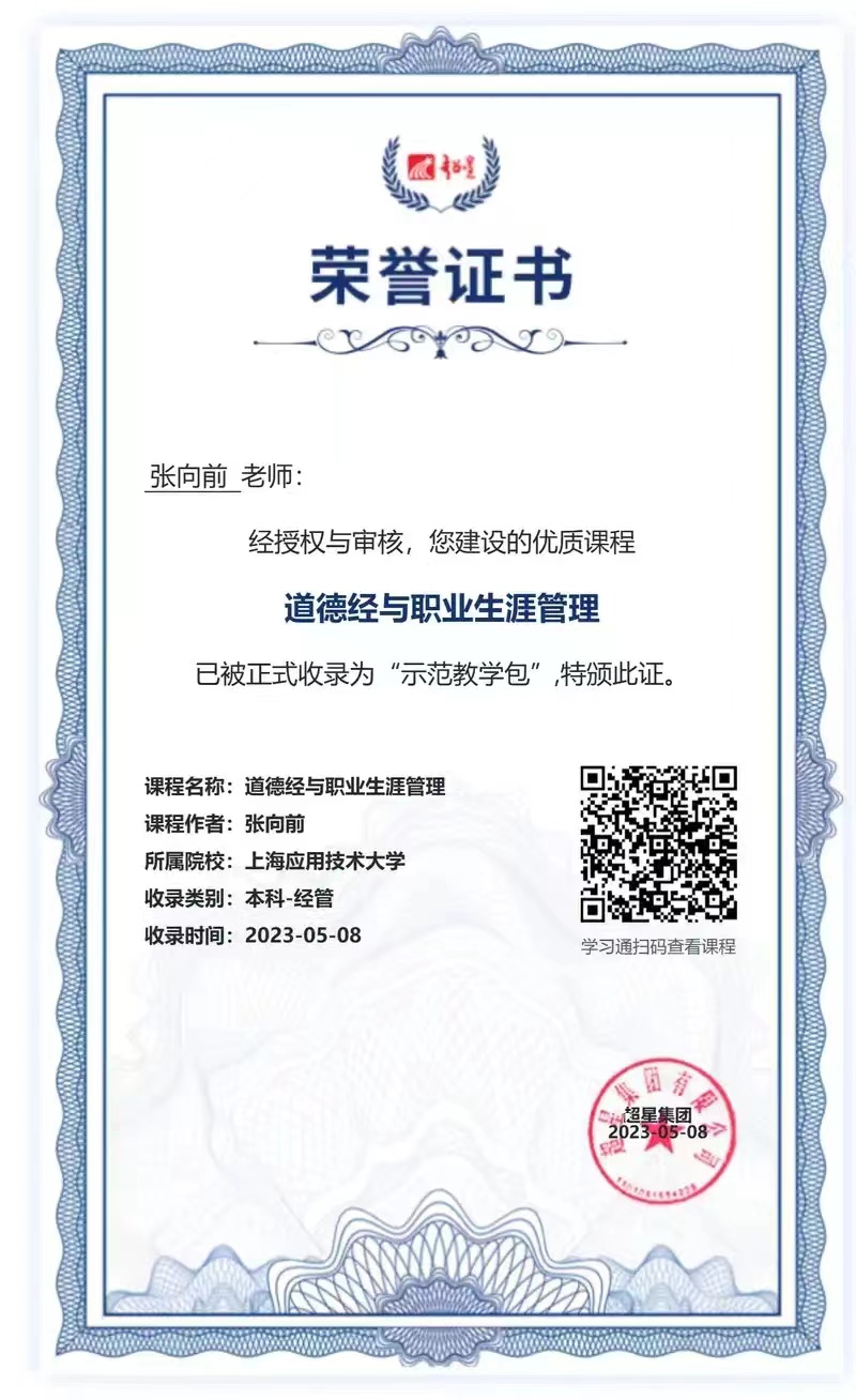 近日,上海应用技术大学人文学院张向前教师团队制作的道德经与职业生涯管理》,以授课内容丰富、制作水平精良、教学效果突出等优势,经超星公司专家评审,被评为优质课程并收录为“示范教学包”。该课程此前还被智慧树平台评为第二届“智慧树杯”课程思政示范案例教学大赛全国二等奖此次“示范教学包”的入选,对于进一步深化思政课改革创新、树立学校课程思政品牌、打造优质课程发挥积极引领与促进作用。