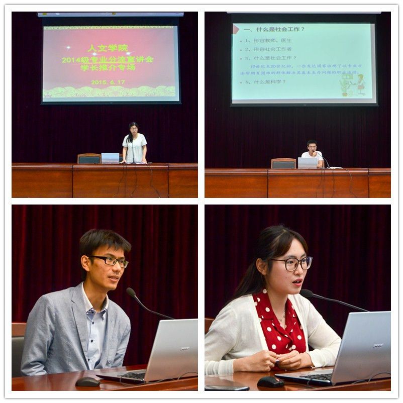 为发挥朋辈教育,更好地引导2014级的学生形成专业认同,合理选择专业,6月17日下午15点,人文学院在图书馆B106举行2014级专业分流学长学姐宣讲会。本次宣讲会由副书记副院长张小懿主持,劳动与社会保障专业09级蒋鑫、社会工作专业11级章异侠、文化产业管理专业12级邓纳敏三位学生参与宣讲,2014级辅导员和大一全体学生参加了宣讲会。