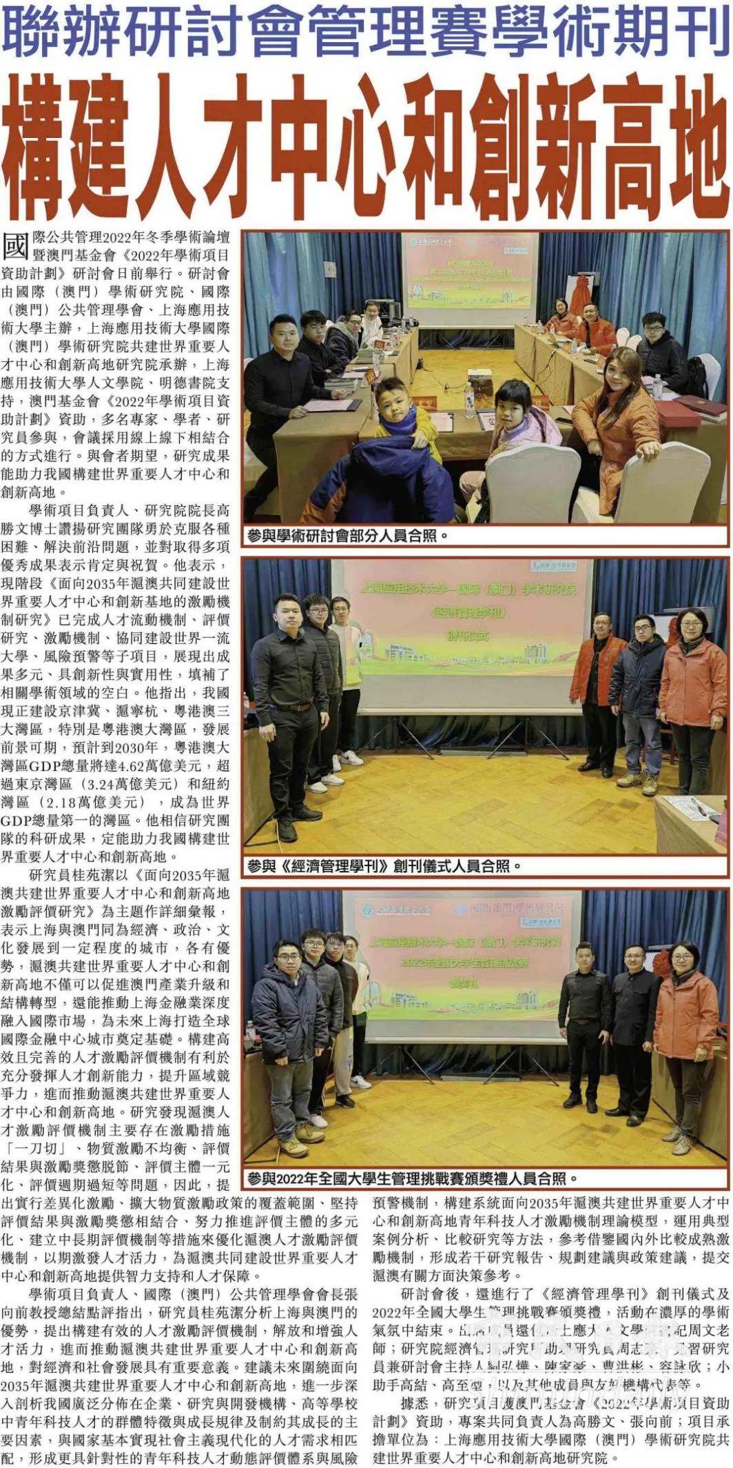 近日,由国际公共管理2022年冬季学术论坛暨澳门基金会《2022年学术项目资助计划》研讨会在我校举行。研讨会由上海应用技术大学国际学术研究院、国际公共管理学会主办,上海应用技术大学国际学术研究院共建世界重要人才中心和创新高地研究院承办,上海应用技术大学人文学院、明德书院支持,澳门基金会《2022年学术项目资助计划》资助,多名专家、学者、研究员参与,会议採用线上线下相结合的方式进行。与会者期望,研究成果能助力我国构建世界重要人才中心和创新高地。