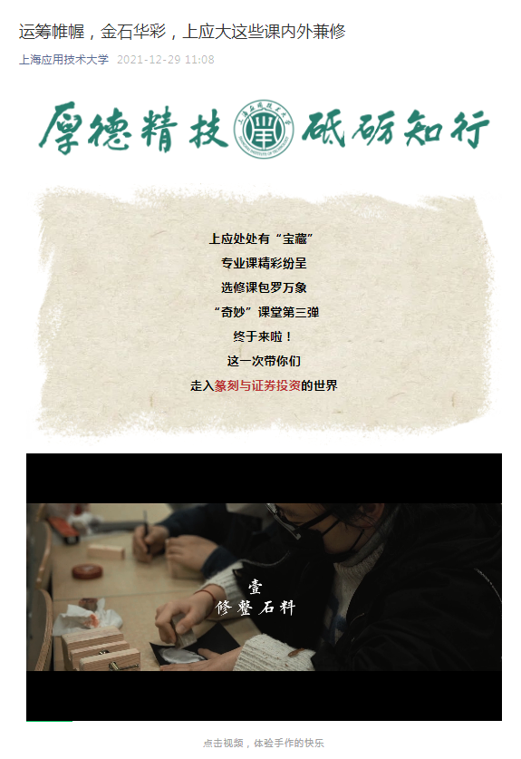 12月29日,学校官方微信公众号对人文学院开设的通识课程《篆刻常识与基本技法》进行了特别报道。