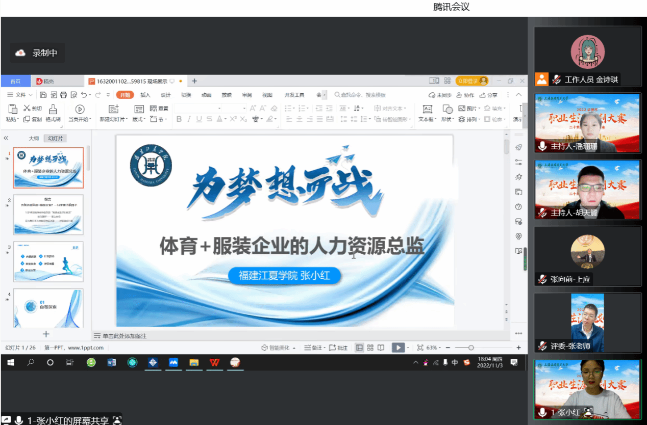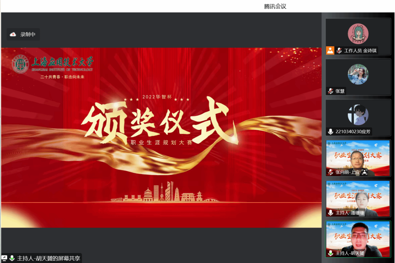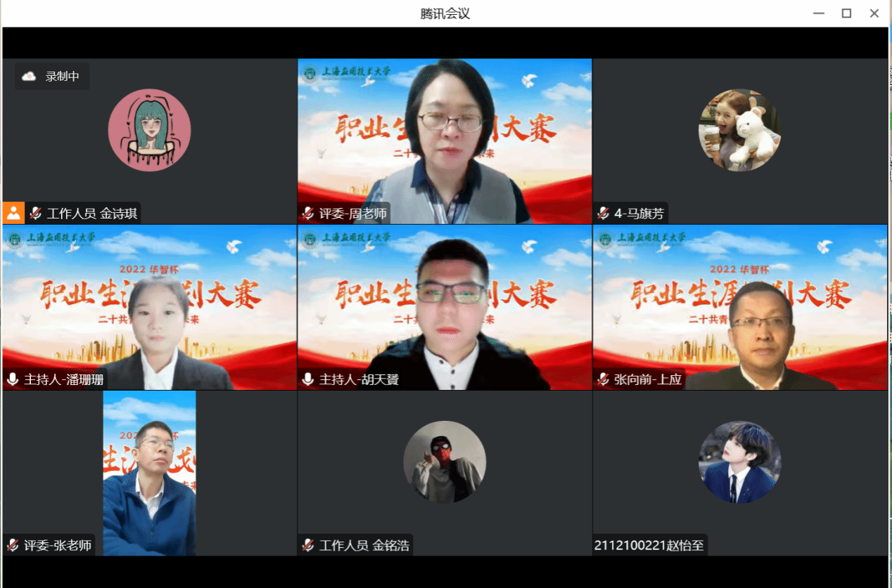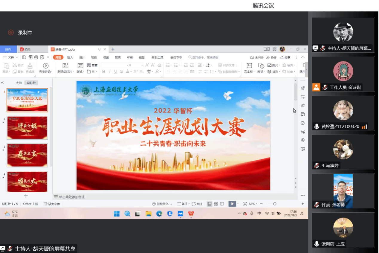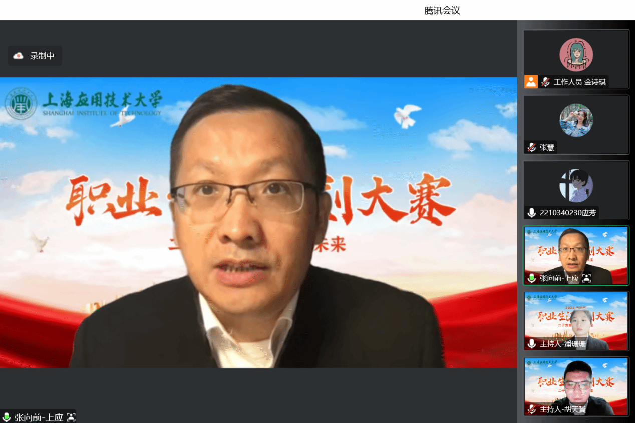 在2022年11月3日星期四18:00,上海应用技术大学2022华智杯职业生涯规划大赛决赛于腾讯会议平台正式举行。出席本次决赛的评委有:校党委学工部张慧老师,赞助单位华智公考代表龚凡老师,人文学院党总支书记周文老师,人文学院党总支副书记、副院长徐津津老师,人文学院劳动与社会保障系书记、副主任张可人老师,人文学院院长张向前等老师作为嘉宾出席决赛活动。