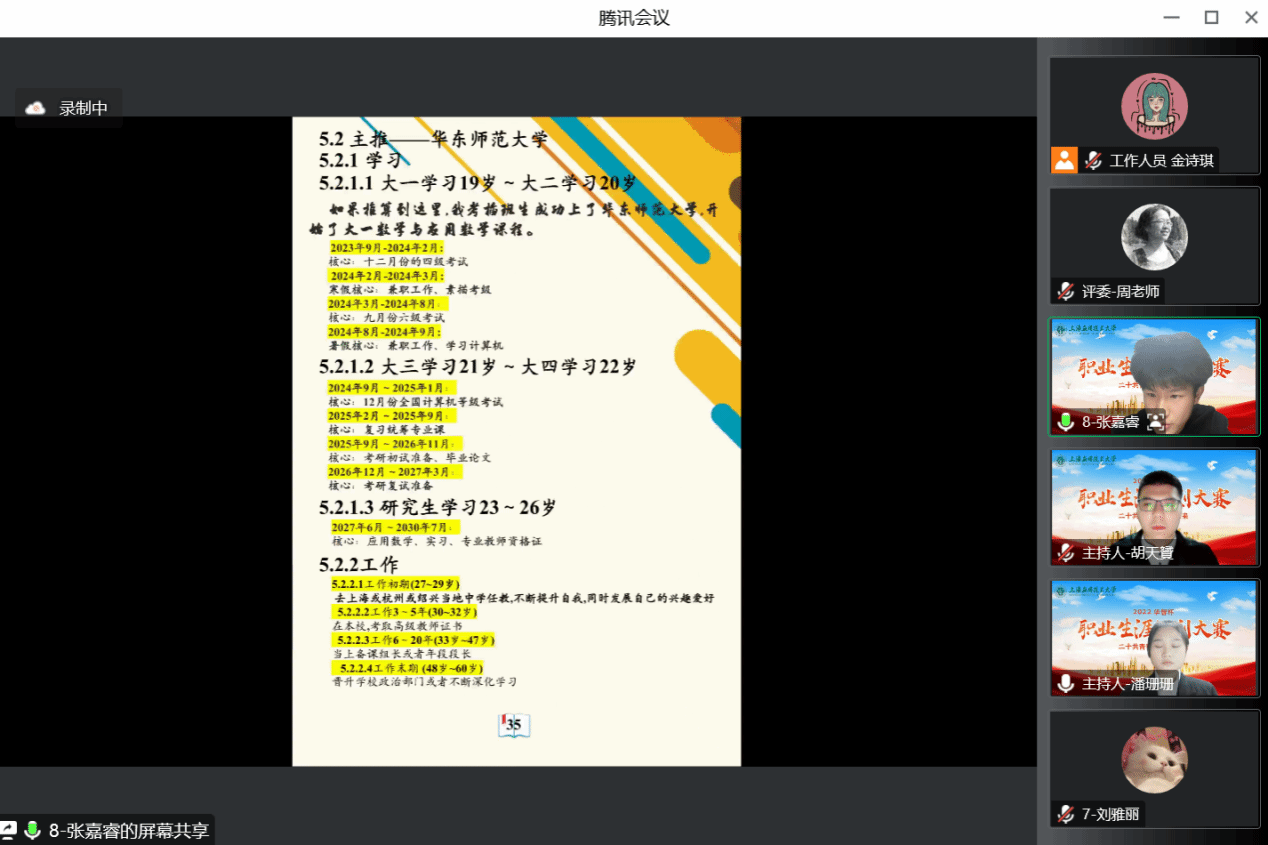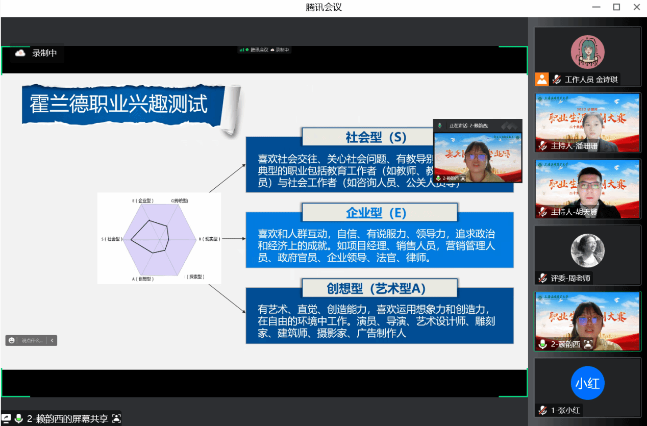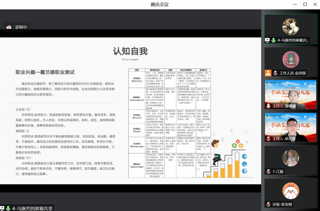 经过前期的充分准备,每位参赛选手按顺序在主持人的引导下依次展示自己的职业生涯规划作品。