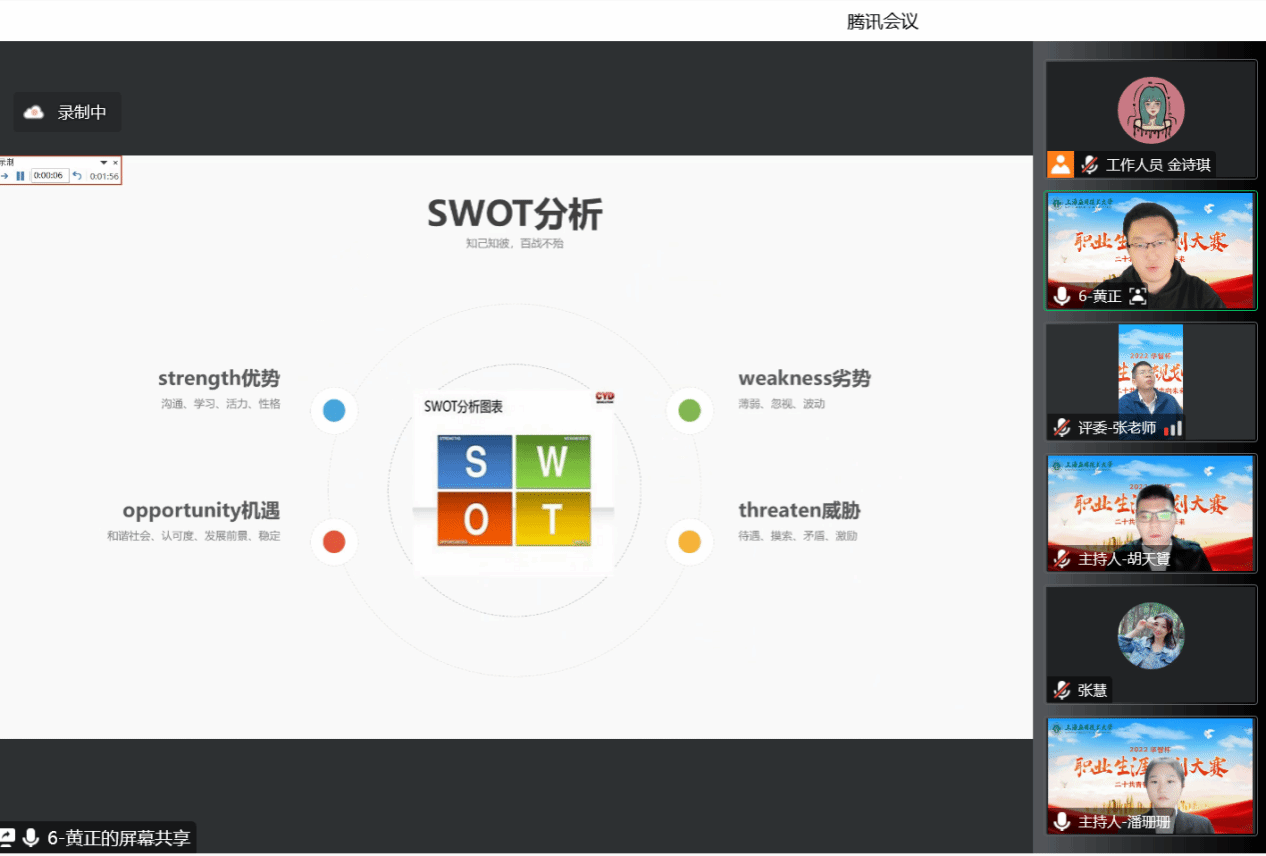 十位选手通过PPT形式展示个人职业生涯规划的成果。采用MBTI职业性格测试与霍兰德职业兴趣自测等方式确定了自我的职业目标,同时通过SWOT分析法将未来职业生涯中密切相关的各种主要内部优势、劣势和外部的机会和威胁等一一列举,并对此进行相应的战略方针制定。此外,选手还对未来进行了充分的细化,为将来的学习与职业生涯进行了长足的规划。