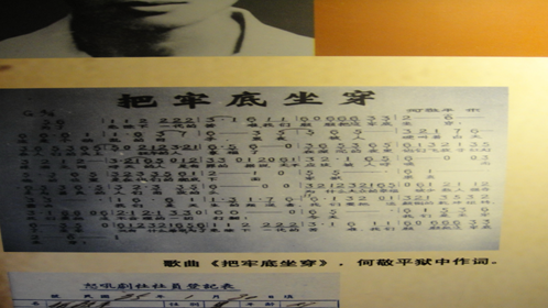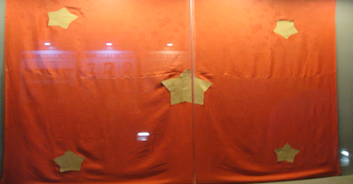 在二楼的一间牢房里,一面“五星红旗”映入眼帘,这就是狱友们绣的五星红旗。当他们听到中华人民共和国成立,第一面五星红旗飘扬在天安门广场上的喜讯后,相互告诉给狱友。由于牢狱与世隔绝,他们凭自己的想象,绣了这面红旗,并畅想未来,可以想象当时他们是多么的激动,他们梦寐以求、为之奋斗的事业终于成为了现实,可他们却仍处在暗无天日的监狱中,他们无法走上街头汇入到欢乐的人海中,无法亲眼看见第一面五星红旗的升起,而只能在心中欢呼,用眼神互相祝贺、传达着喜悦之情。