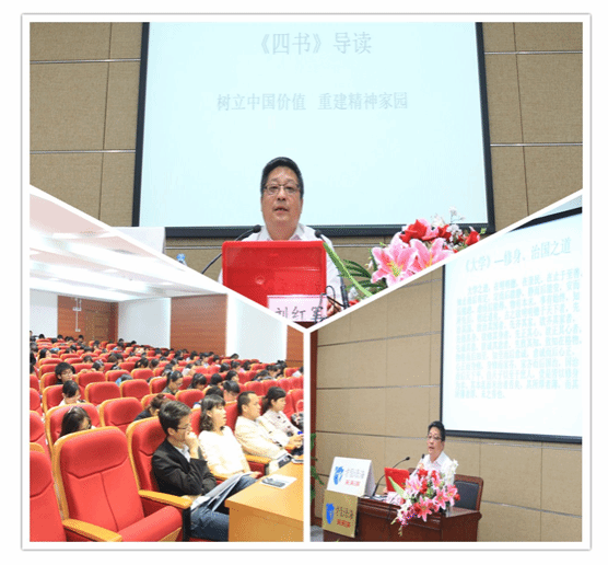 讲座初始,刘院长对我院主推的修身工程之一的读书活动进行了介绍。之后,刘院长从“我们的精神家园正在沦落”这一社会问题和近期上海市读书调查报告谈起,提出了精神家园重建的必要性!接着刘院长开始阐述何谓“经典”、经典读法,并就《四书》展开了导读:《大学》中的修身治国之道,《中庸》中的完美处世之道,《论语》中的“仁”和“孝”,《孟子》中的“民本”与“正气,刘院长的解读让大家从宏观上对四书有了进一步的理解和认识,也激发了大家对四书的阅读兴趣。