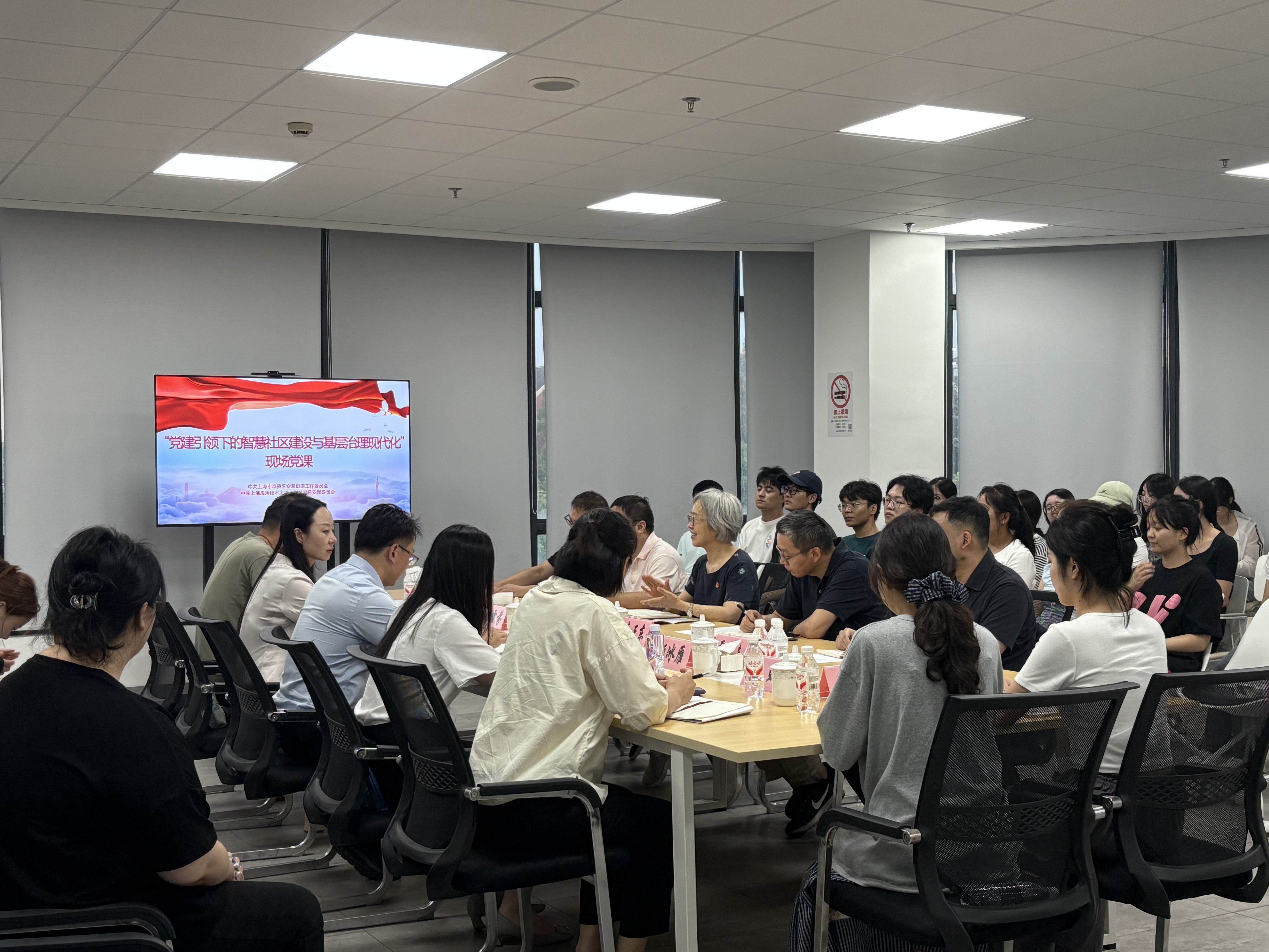 党课伊始,师生一行参观了金海街道的龙潭社区、星海创立方、丰乐社区,并实地听取三个社区的党支部书记分别介绍党建引领社区治理的特色工作,直观感受基层治理现代化的生动实践。龙潭社区书记周桂华结合自己数十年的社区工作经历,生动讲述了龙潭社区通过建强党组织体系、发挥党员先锋模范作用,把一个新兴社区建设成为了管理有序、服务完善、文明和谐的幸福家园。星海创立方的党支部书记林亚庆,详细介绍星海创立方2.0创新产业空间,集创业孵化、人才服务、社区服务于一体,是金海街道推动产城融合、提升区域活力的重要载体。丰乐社区党支部书记吕虹为大家系统分享了公租房社区在党建引领下,如何通过“精准、精细、精心”三维服务体系,打造"睦邻丰乐"家园的亮点特色,全力实现人才“安心居住、安身生活、安业发展”的目标。从租客融入、人群融合到文化融汇,丰乐社区的创新实践为同学们提供了一个研究超大城市社区治理的宝贵样本。