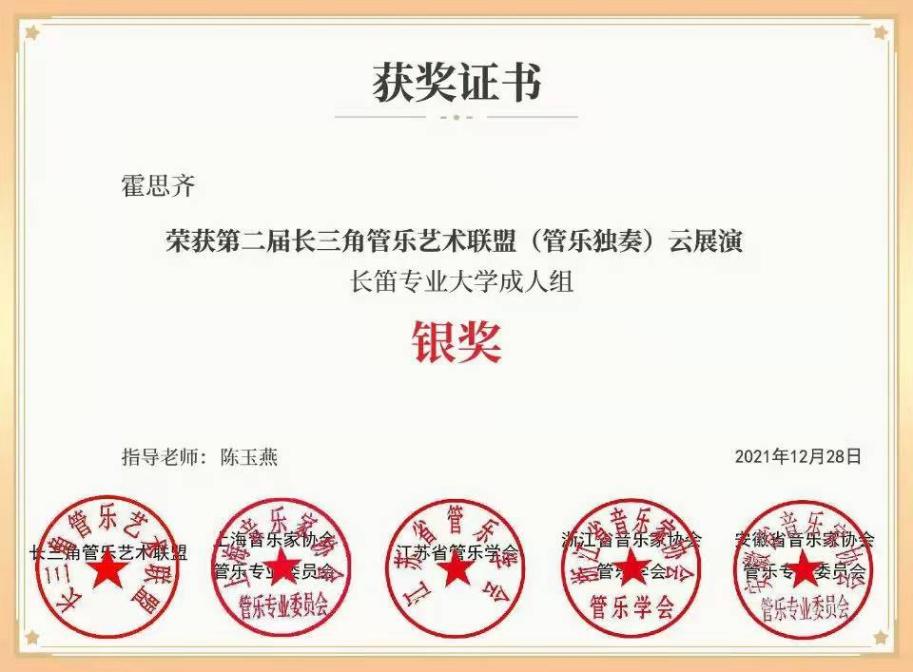 近日,我校人文学院陈玉燕老师指导的管乐团成员吴秉亮、霍思齐代表学校参加第二届长三角管乐艺术联盟云展演并获得银奖。