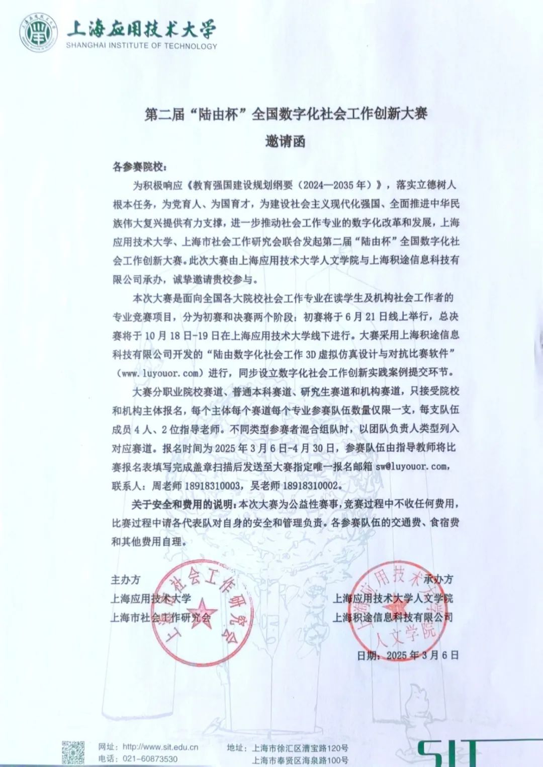 为积极响应《教育强国建设规划纲要(2024—2035年)》,落实立德树人根本任务,为党育人、为国育才,为建设社会主义现代化强国、全面推进中华民族伟大复兴提供有力支撑,进一步推动社会工作专业的数字化改革和发展,上海应用技术大学、上海市社会工作研究会联合发起第二届“陆由杯”全国数字化社会工作创新大赛。此次大赛由上海应用技术大学人文学院与上海积途信息科技有限公司承办,诚挚邀请贵校参与。