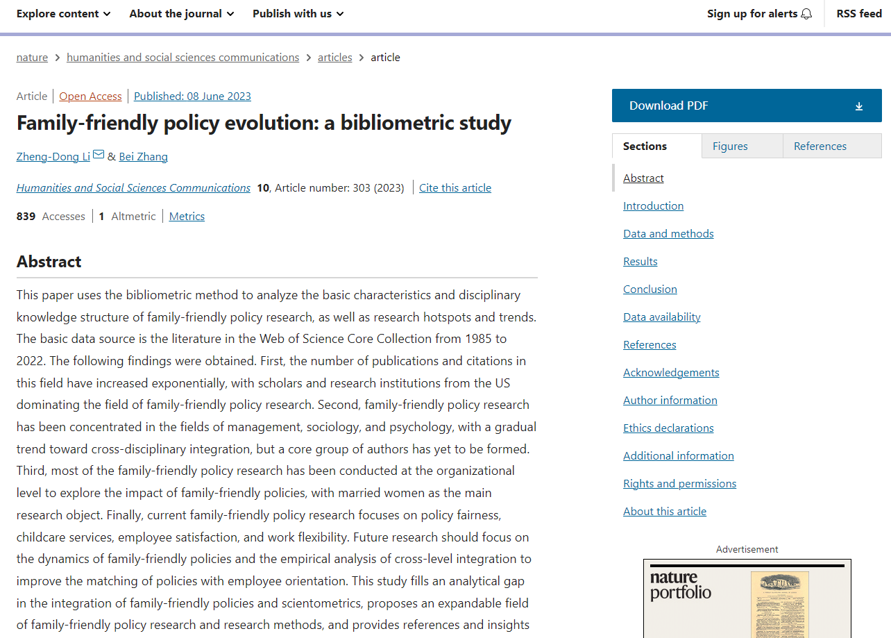 文章信息与网址链接:Li, ZD., Zhang, B. Family-friendly policy evolution: a bibliometric study. Humanities and Social Sciences communications 10, 303 (2023).
