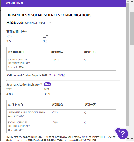 Humanities & Social Sciences CommunicationsHSSC)是Nature旗下唯一面向人文社会科学的子刊,致力于出版人文、社会与行为科学等综合领域的高水平研究,被SSCIA&HCI共同索引,在JCRJCI报告中的人文领域(Humanities)、社会科学(Social Science)领域分区排名均为Q1,在全球人文社科领域具有重要影响力。HSSC期刊引用指数(Journal Citation Indicator)为4.83,在人文等多学科领域的395种期刊中排名第3,在社会科学等多学科领域的265种期刊中排名第1。此项科研成果的发表,有助于提高我校人文社会科学学科在国内外的学术影响力。