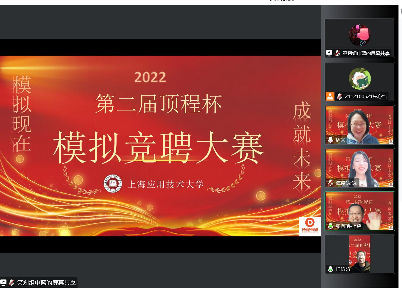 大赛由中共上海应用技术大学党委学工部主办,上海顶程教育科技有限公司独家冠名赞助,上海应用技术大学人文学院协办,上海应用技术大学明德书院承办,国际学术研究院、国际学术研究院经济管理研究所、国际公共管理学会为学术支持单位。我校经济与管理学院、计算机科学与信息工程学院、生态技术与工程学院等各学院、各年级的本科生,以及莆田学院、上海体育学院均有组队参加。大赛举办线上系列讲座,158人组成团队入围初赛,21个团队进入复赛。复赛阶段采用撰写模拟竞聘书+团队竞聘视频+个人简历复合评比,最终通过激烈地角逐,共有七组选手进入决赛。